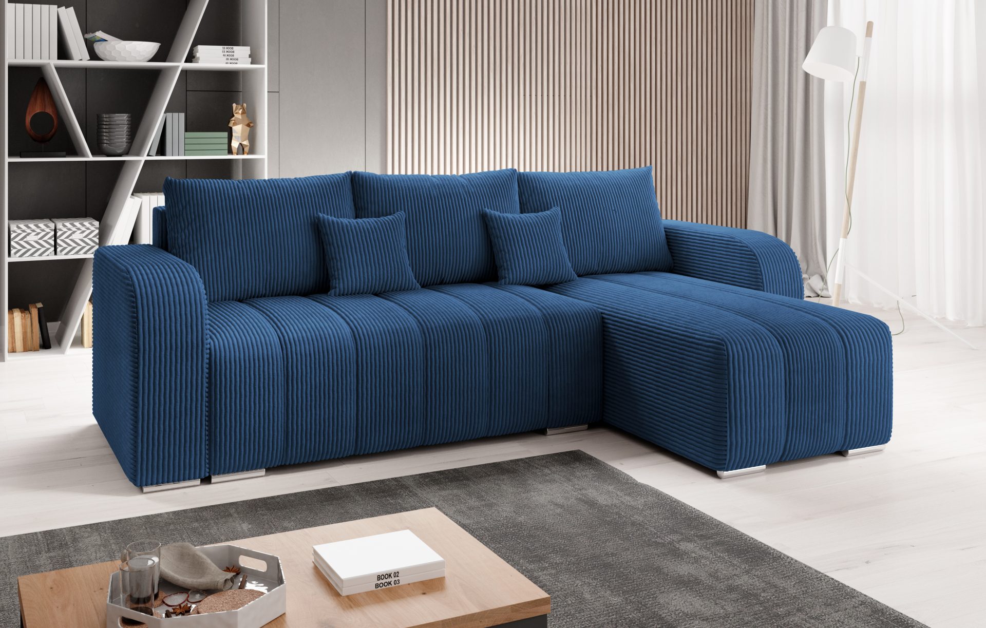 Szlachetny granatowy kolor i miękka sztruksowa faktura sprawiają, że wnętrze staje się bardziej przytulne. Narożnik Pufetto to mebel, który tworzy w domu idealną przestrzeń do relaksu i wspólnego spędzania czasu.