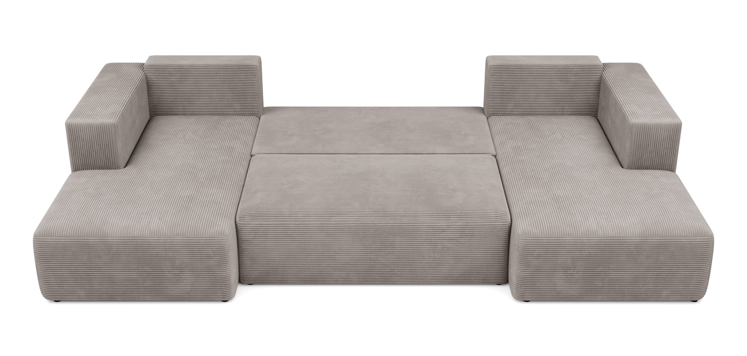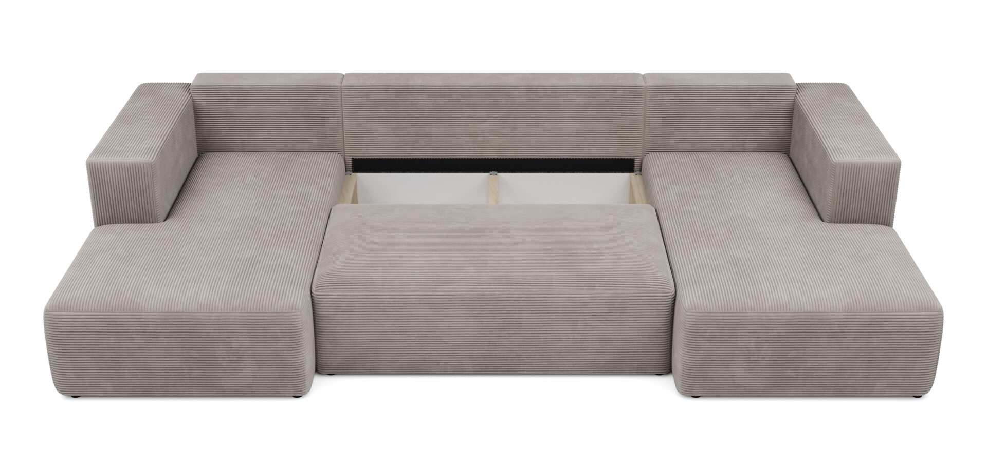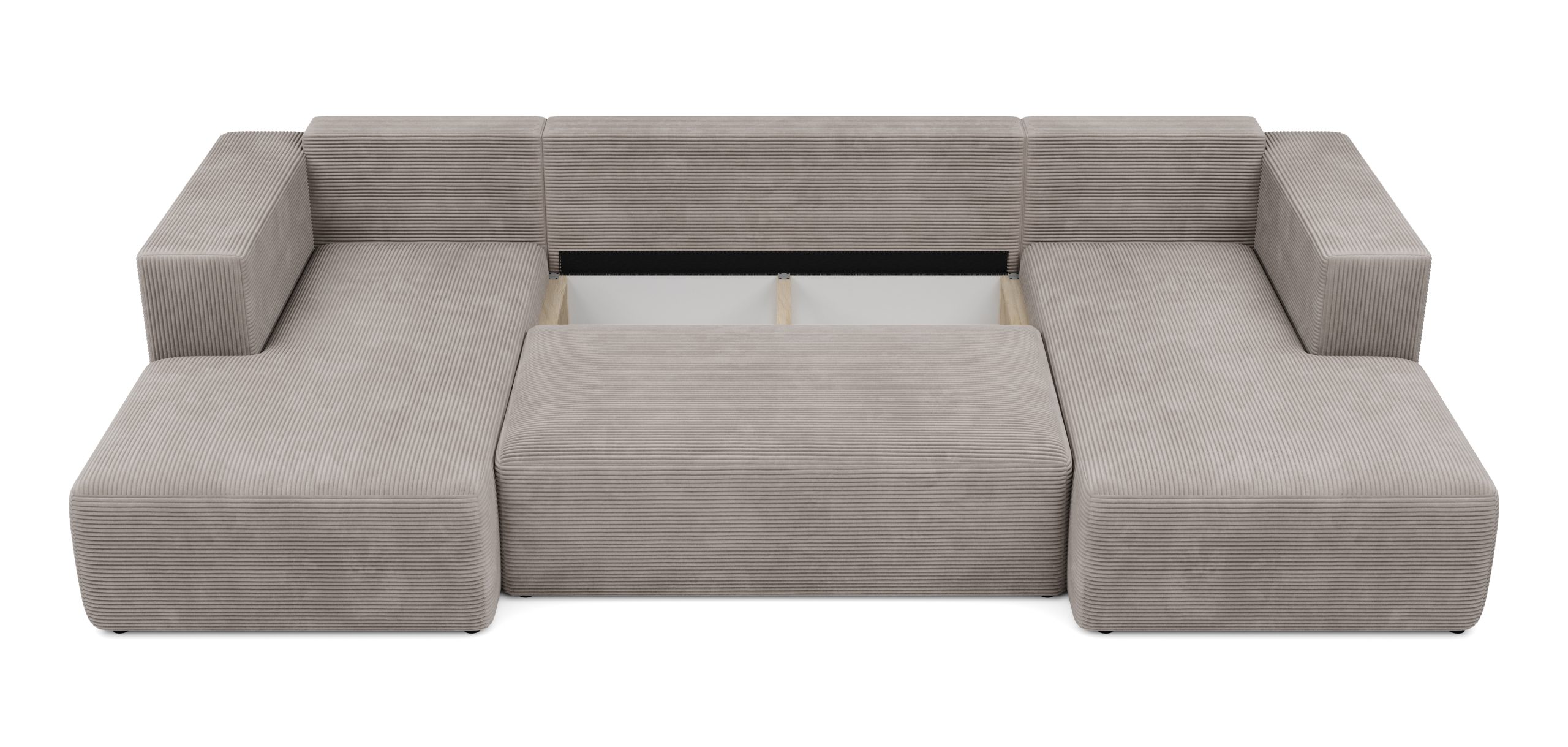 Narożnik Stripes U z łatwością dopasowuje się do rytmu dnia. Posiada duży pojemnik na pościel, który pomaga utrzymać porządek w salonie. Schowasz w nim dodatkowe koce, poduszki lub kołdrę dla gości. Z kolei wieczorem mebel szybko zamieni się w komfortowe łóżko. Wystarczy skorzystać z funkcji spania, której rozkładanie za pomocą automatu DL jest niezwykle proste i nie wymaga wysiłku. W ten sposób zyskujesz dodatkowe miejsce do spania na wypadek wizyty bliskich.