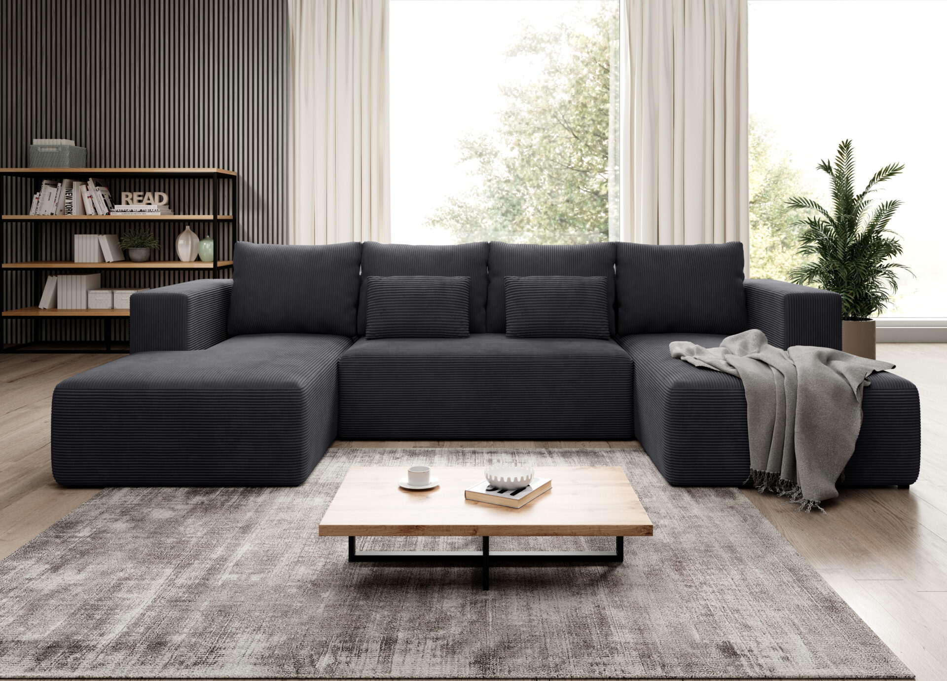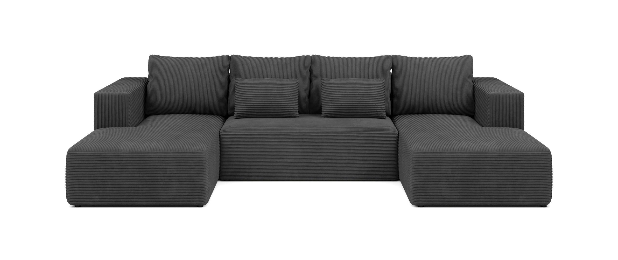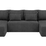 Jego rozłożysty kształt w formie litery U tworzy idealne miejsce do spotkań z rodziną i przyjaciółmi. Ten model staje się naturalnym centrum domowego życia, gdzie każdy znajdzie dla siebie wygodny kąt. Głęboki, grafitowy kolor tapicerki wprowadza do wnętrza atmosferę elegancji i spokoju. Dlatego doskonale pasuje do aranżacji nowoczesnych oraz tych inspirowanych stylem boho. Ten szlachetny odcień stanowi świetną bazę dla kolorowych dodatków, pozwalając na swobodę w dekorowaniu salonu.