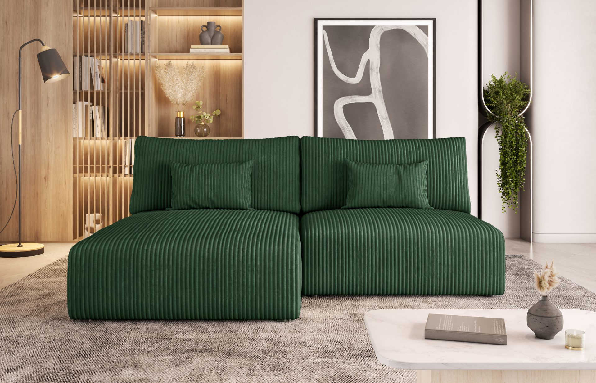 Dzięki przemyślanym funkcjom i wyjątkowej barwie, butelkowozielony narożnik Modulo staje się centrum domowego życia, pełnego komfortu i stylu.