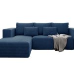 Jego klasyczna forma w kształcie litery L doskonale wpisuje się w nowoczesne i tradycyjne aranżacje. Głęboki granatowy odcień wprowadza do salonu atmosferę spokoju i elegancji. Staje się on wyrazistym akcentem, który pięknie komponuje się z jasnymi ścianami lub naturalnym drewnem. Co ważne, tapicerowany tył mebla pozwala na swobodne ustawienie go w dowolnym miejscu. Dzięki temu narożnik może stać się centralnym punktem pokoju dziennego.