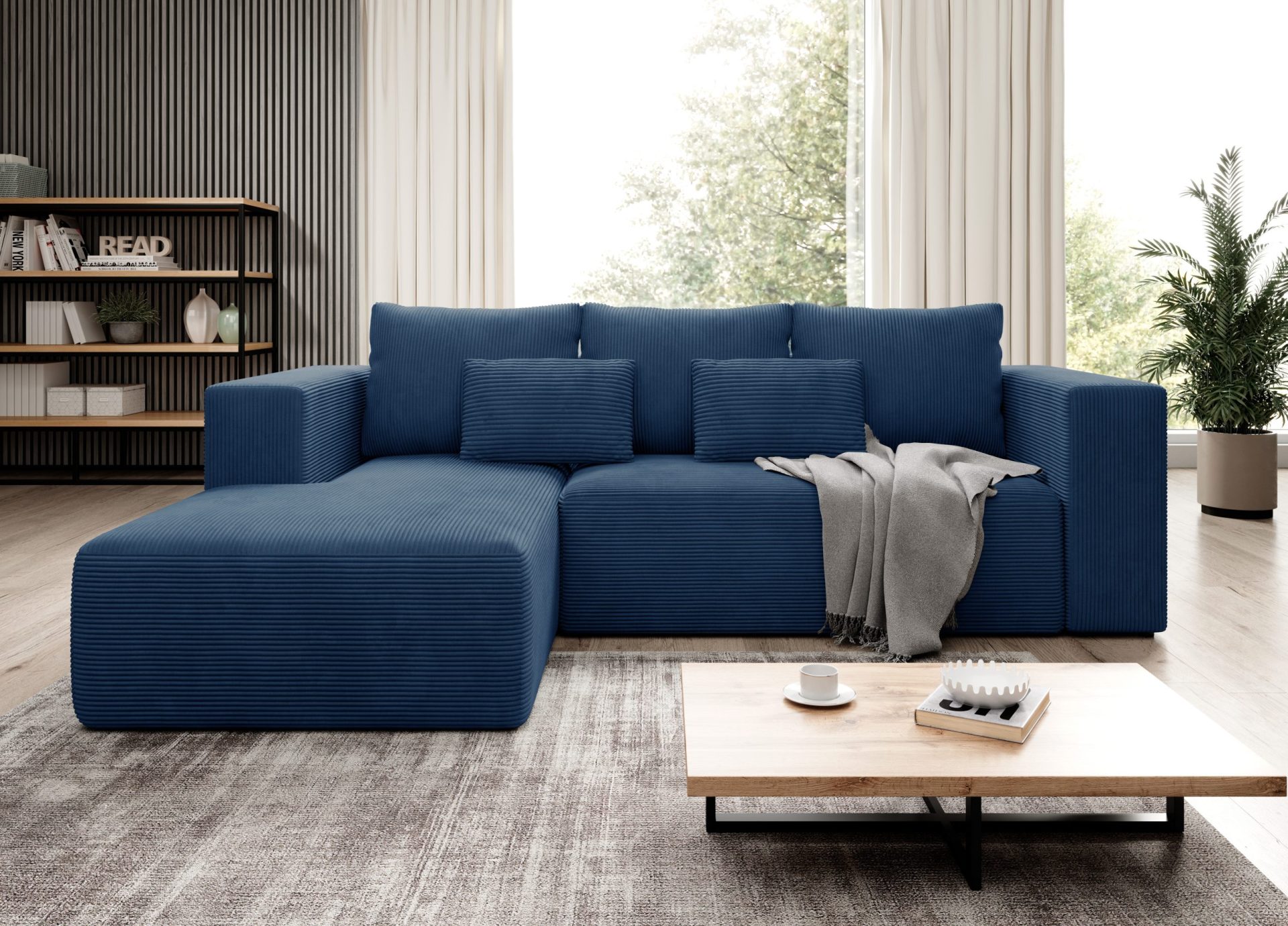 Tkanina obiciowa Poso to miękki w dotyku sztruks o wyjątkowych właściwościach. Jest przyjazna zwierzętom, co pozwala cieszyć się wspólnym wypoczynkiem z pupilem bez obaw o stan mebla. Technologia utrudnionego wchłaniania cieczy chroni przed plamami po rozlanym napoju. Dlatego utrzymanie granatowego narożnika Stripes w czystości jest niezwykle proste i nie zakłóca spokoju domowego życia.