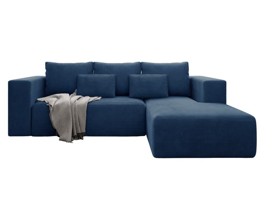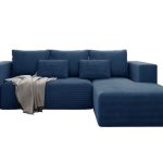 Jego głęboki, nasycony kolor wprowadza do wnętrza atmosferę spokoju oraz elegancji. Granatowy odcień świetnie komponuje się z jasnymi ścianami, drewnem lub metalowymi dodatkami. Stanowi mocny, a zarazem klasyczny akcent w salonie. Narożnik ma praktyczny kształt litery L. Dzięki temu idealnie wyznacza strefę wypoczynku w pokoju dziennym. Co ważne, jego tył również został obity tkaniną, co pozwala na swobodne ustawienie mebla nawet na środku pomieszczenia.