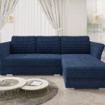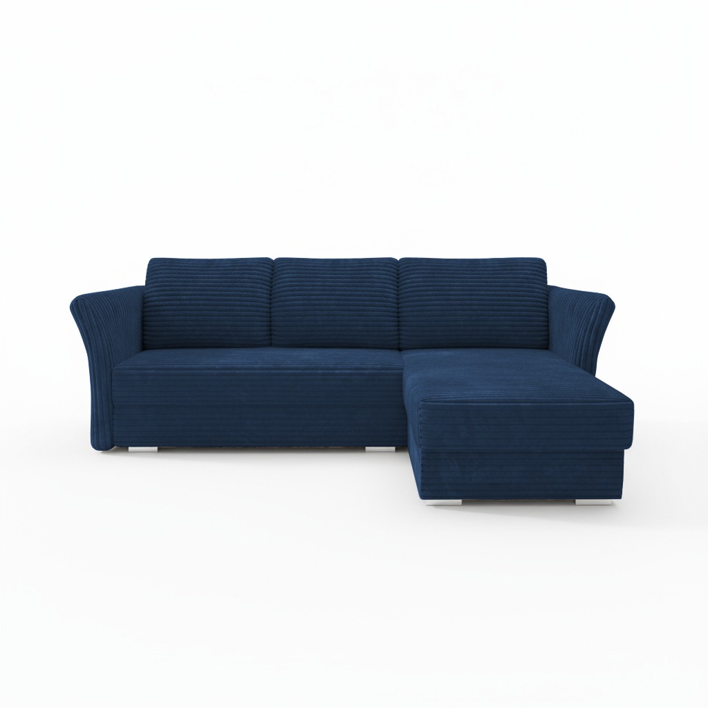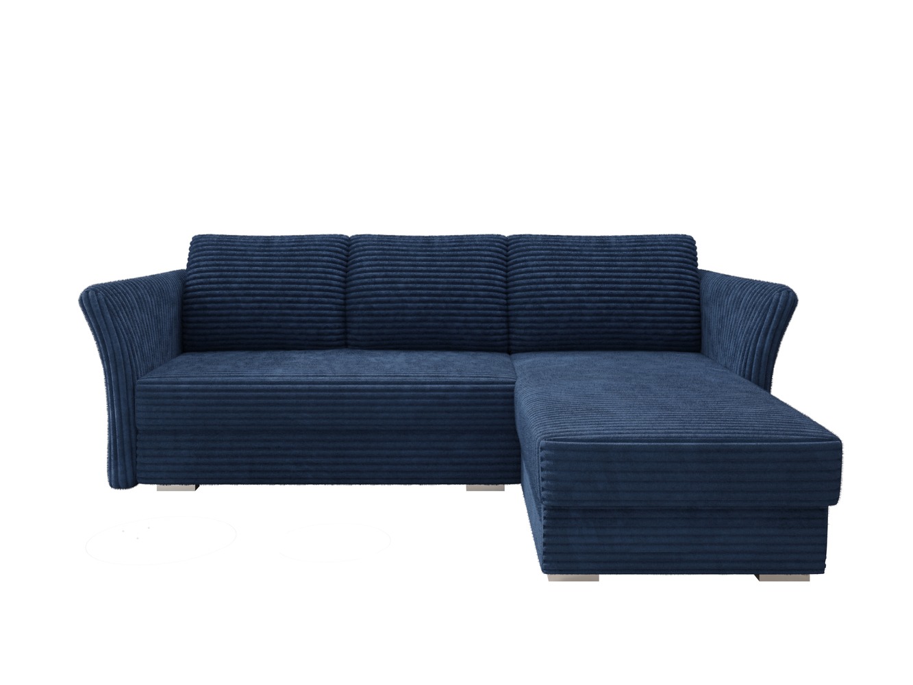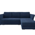 Jego klasyczny kształt w formie litery L idealnie wpasuje się w przestrzeń salonu. Niskie, chromowane nóżki dodają mu lekkości oraz nowoczesnego charakteru. Głęboki, granatowy kolor obicia wprowadza do pomieszczenia atmosferę spokoju i wyrafinowania. Dlatego świetnie komponuje się z drewnianymi dodatkami lub metalicznymi akcentami, tworząc spójną aranżację.