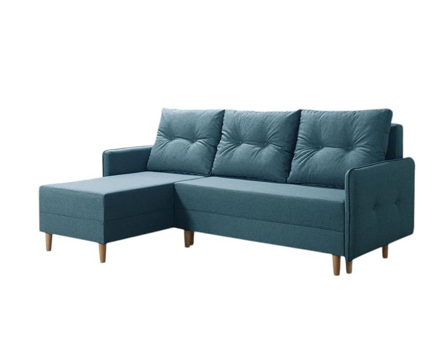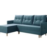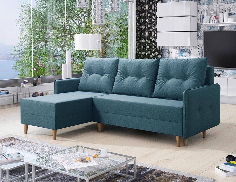 Jego forma w literze L doskonale organizuje przestrzeń w salonie. Wysokie nóżki z drewna bukowego dodają konstrukcji wizualnej lekkości. Umożliwiają też wygodne sprzątanie pod meblem. Głęboki, turkusowy odcień wprowadza do wnętrza energię i powiew świeżości. Dzięki niemu aranżacja staje się wyrazista i niepowtarzalna. Co ważne, tapicerowany tył pozwala ustawić narożnik w dowolnym miejscu, nawet na środku pokoju.