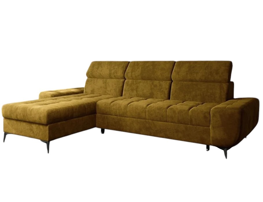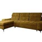 Model ten ma nowoczesny, L-kształtny układ. Dlatego świetnie organizuje przestrzeń w salonie. Jego ciepły, musztardowy odcień wprowadza do pomieszczenia mnóstwo pozytywnej energii. Wspaniale ożywia minimalistyczne aranżacje lub dopełnia wnętrza w stylu retro. Wysokie, czarne nóżki dodają sylwetce lekkości. Co ważne, tapicerowany tył mebla pozwala ustawić go w dowolnym miejscu, nawet na środku pokoju.
