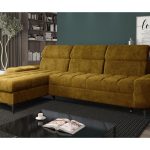 Musztardowy narożnik Como jest przy tym wyjątkowo praktyczny. Jego welurowa tapicerka jest przyjazna zwierzętom i ułatwia czyszczenie. Specjalna powłoka utrudnia wchłanianie płynów, co daje czas na usunięcie zabrudzenia. Mebel wyposażono także w funkcję spania. Proste rozkładanie za pomocą automatu Delfin błyskawicznie tworzy wygodne miejsce dla gości. Pojemny schowek w otomanie pomaga utrzymać porządek, mieszcząc zapasową pościel lub koce.