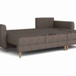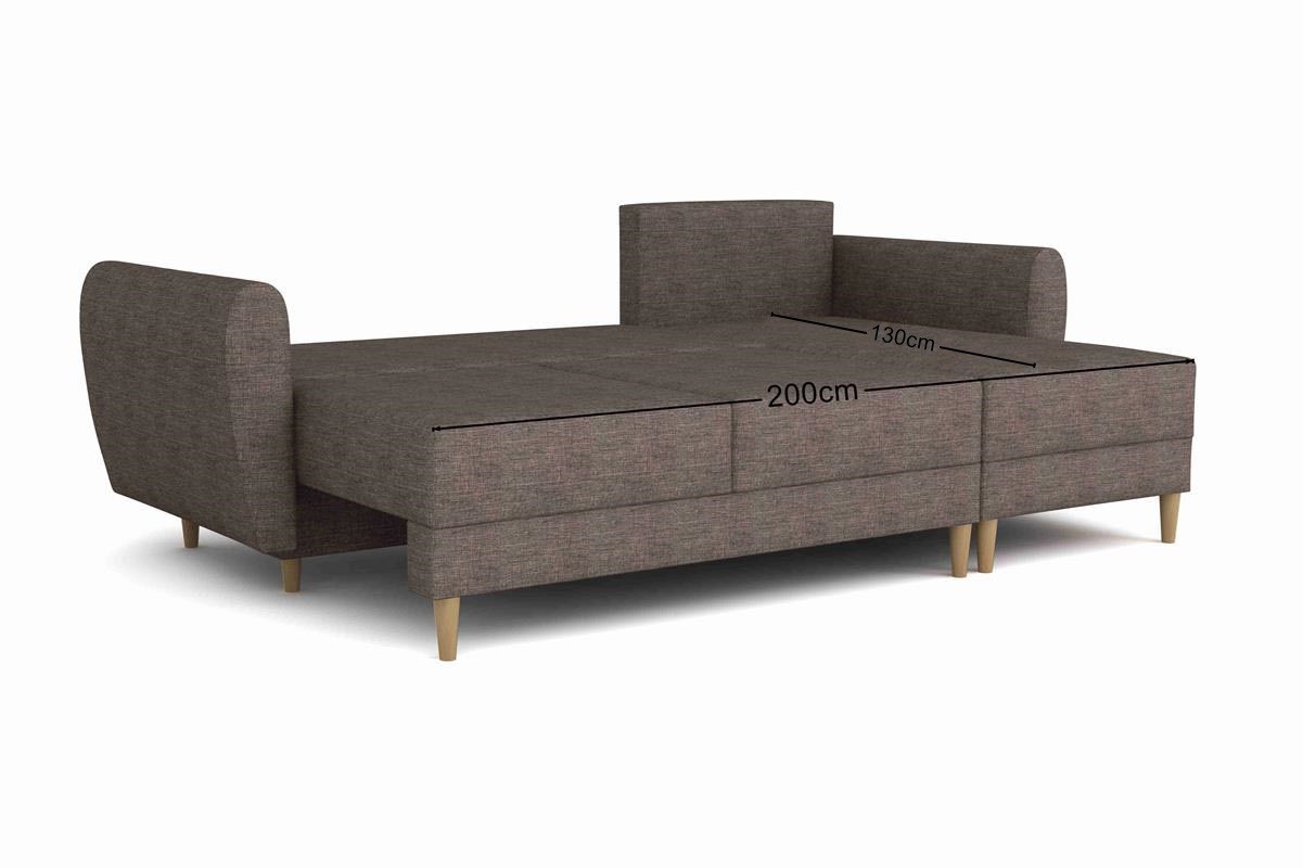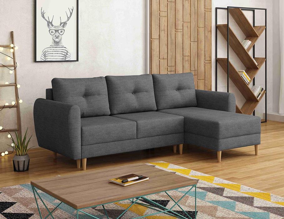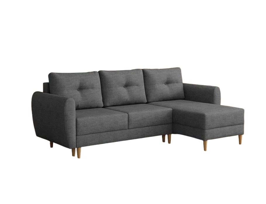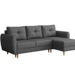 Jego klasyczna forma w kształcie litery L opiera się na wysokich, drewnianych nóżkach w kolorze naturalnego buku. Nadają one całej bryle wizualnej lekkości. Głęboki, ciemnoszary odcień tapicerki jest niezwykle uniwersalny. Dlatego doskonale pasuje do wnętrz nowoczesnych i minimalistycznych. Co ważne, tył mebla również pokryto tkaniną. Dzięki temu narożnik może stanąć w centralnym punkcie salonu, subtelnie wyznaczając strefę relaksu.