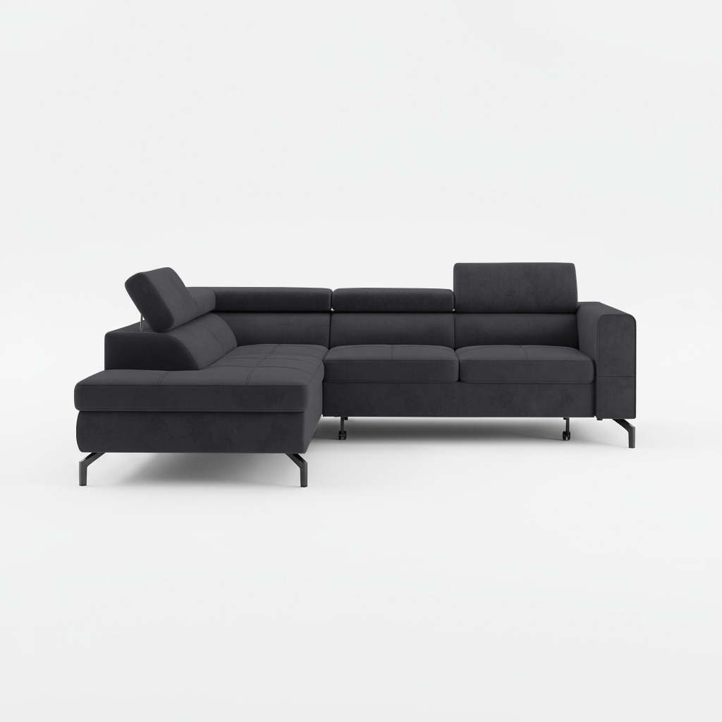Narożnik stworzono z myślą o codziennej wygodzie. Siedzisko wypełnione sprężynami falistymi i pianką zapewnia komfortowe miejsce do odpoczynku po pracy. Dzięki temu mebel zachowuje sprężystość i nie odkształca się podczas użytkowania. Z kolei regulowane zagłówki pozwalają każdemu domownikowi dopasować oparcie do własnych potrzeb. Idealnie sprawdzają się podczas wieczornego seansu filmowego lub czytania książki.