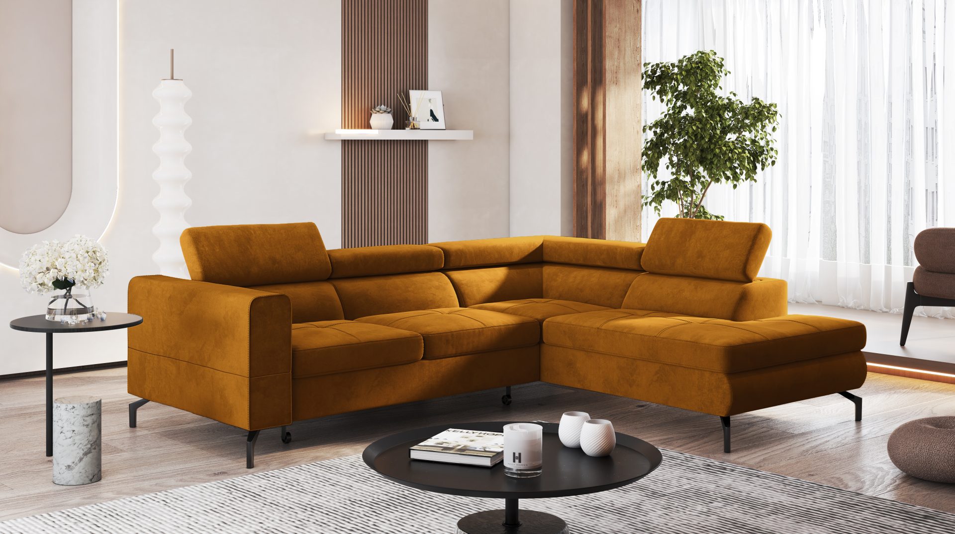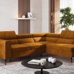 Jego nowoczesna bryła w kształcie litery L opiera się na smukłych, czarnych nóżkach. Nadają one całej konstrukcji wizualnej lekkości. Intensywny musztardowy odcień staje się wyrazistym akcentem we wnętrzu. Ożywia aranżacje w stylu klasycznym lub nowoczesnym. Dzięki temu salon zyskuje niepowtarzalny charakter pełen optymizmu. Co ważne, tapicerowany tył pozwala swobodnie ustawić mebel w dowolnym miejscu. Może on stać się centralnym punktem otwartej przestrzeni dziennej.