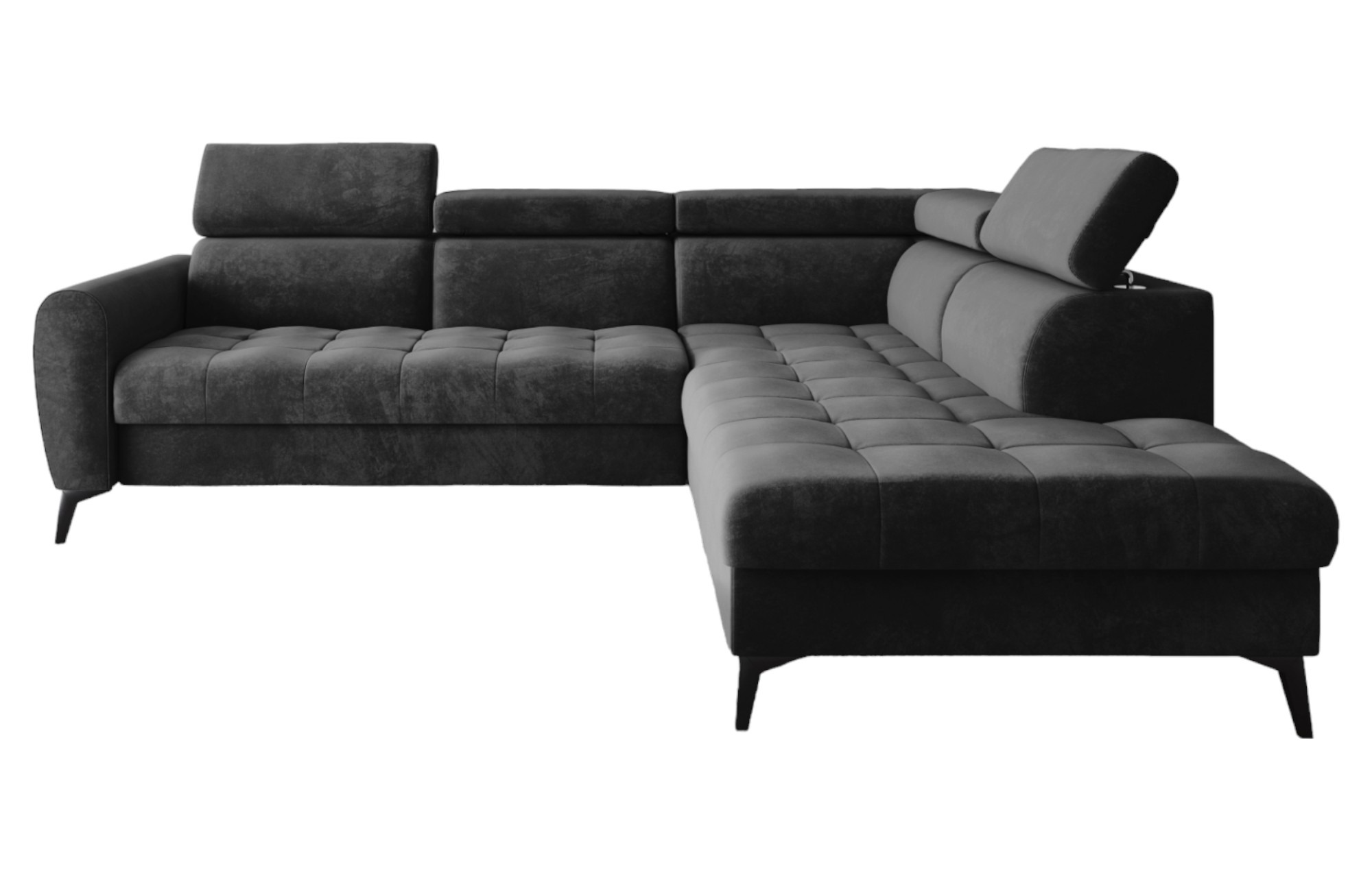 Przemyślany układ w kształcie litery L sprzyja wspólnemu spędzaniu czasu. Grafitowy kolor tkaniny tworzy w pomieszczeniu stonowaną, elegancką bazę. Idealnie komponuje się z drewnem, bielą lub mocniejszymi akcentami kolorystycznymi, nadając wnętrzu wyrafinowany charakter. Siedzisko wypełnione sprężynami falistymi oraz pianką zapewnia stabilne podparcie i przyjemną miękkość. Dzięki temu codzienne użytkowanie jest zawsze komfortowe. Z kolei po długim dniu pracy regulowane zagłówki pozwalają idealnie dopasować wysokość oparcia do indywidualnych potrzeb, gwarantując pełne odprężenie.