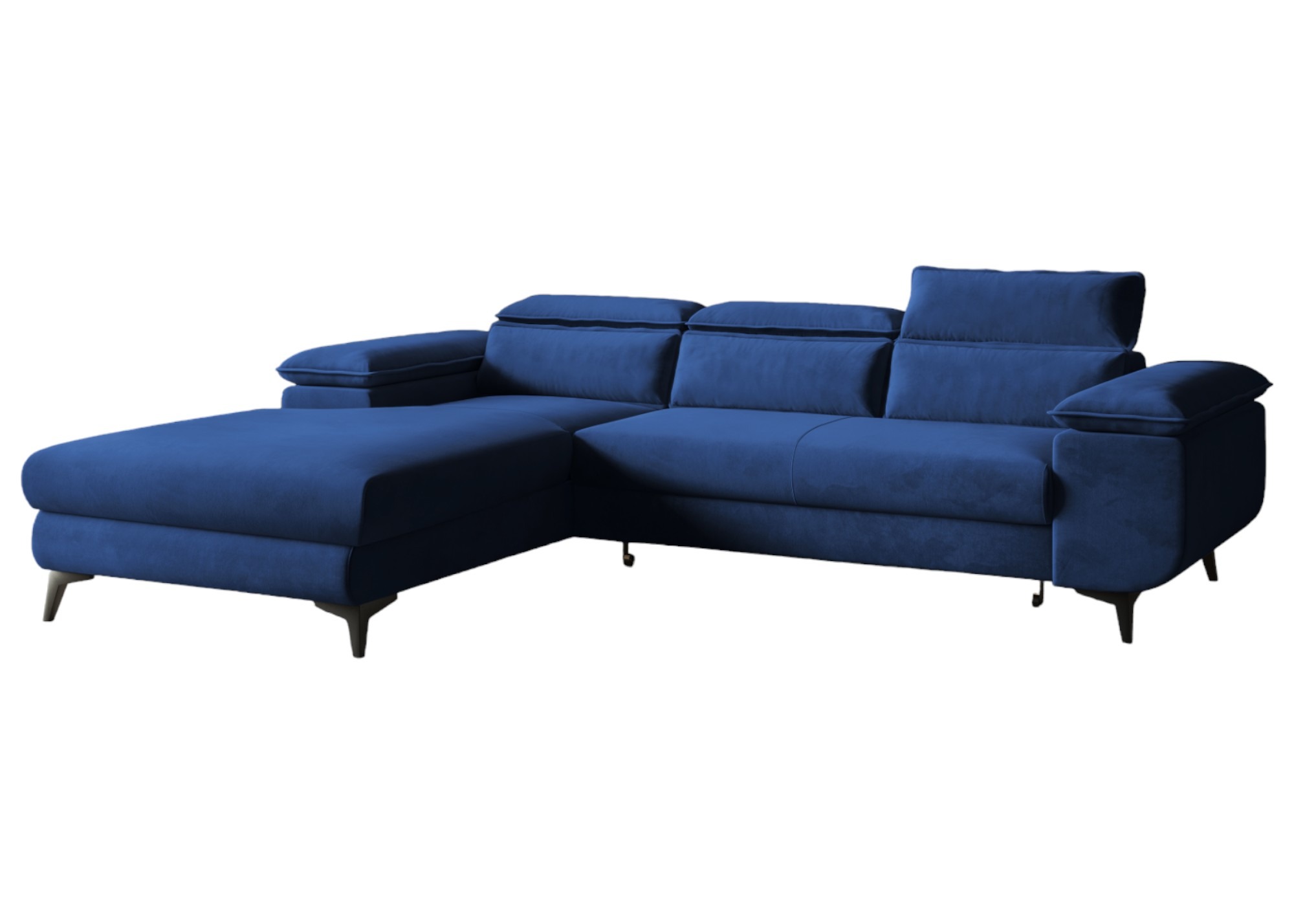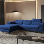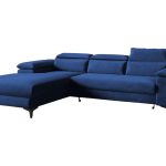 Jego klasyczna bryła w kształcie litery L doskonale odnajdzie się w nowoczesnych aranżacjach. Prosta forma została osadzona na wysokich, czarnych nóżkach, które dodają konstrukcji wizualnej lekkości. Głęboki granat tapicerki tworzy we wnętrzu atmosferę elegancji i wyciszenia. Dlatego mebel staje się wyrazistym akcentem, który pięknie komponuje się z drewnem lub metalowymi dodatkami. Co ważne, tapicerowany tył pozwala na dowolne ustawienie narożnika w salonie.