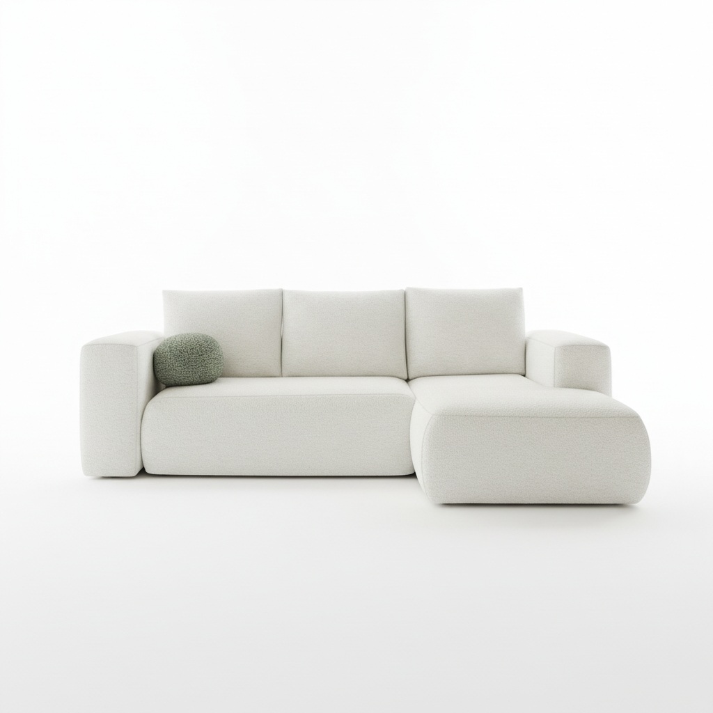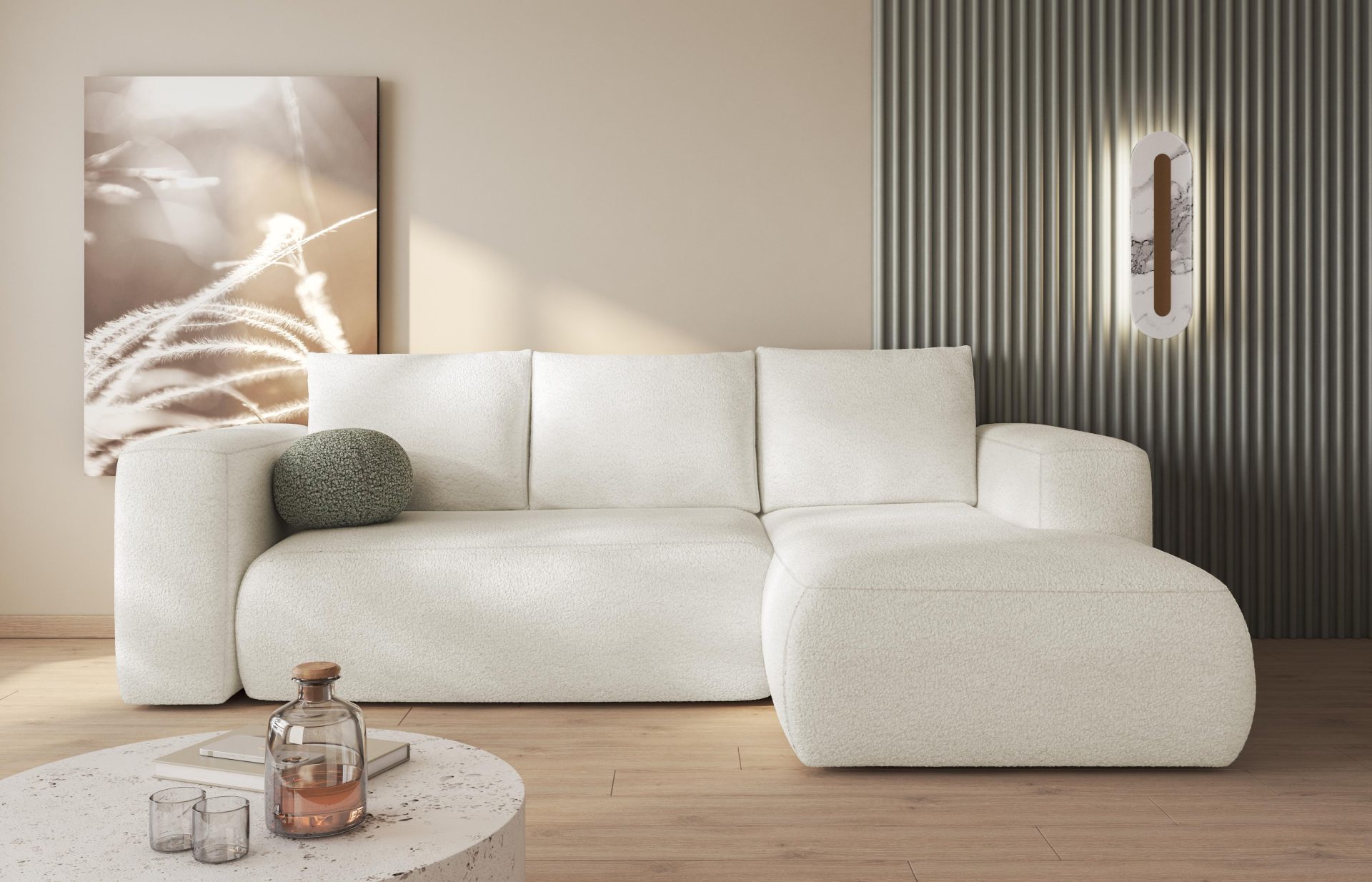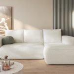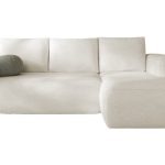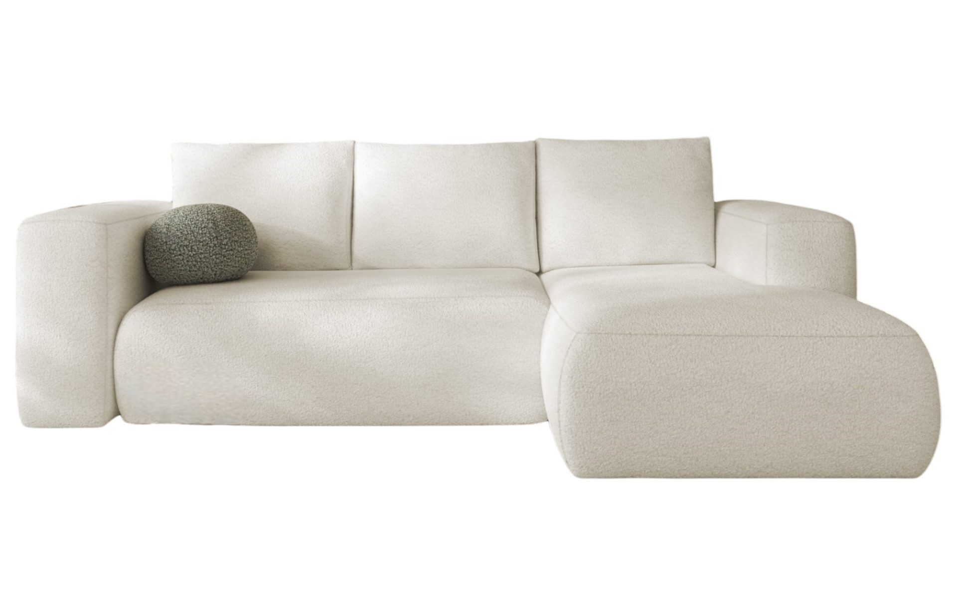 Jego nowoczesna bryła w kształcie litery L świetnie odnajduje się we współczesnych wnętrzach. Komponuje się też z aranżacjami w stylu boho. Jasny, kremowy odcień wprowadza do salonu atmosferę spokoju i ciepła. Dzięki niemu wnętrze staje się jaśniejsze oraz bardziej przytulne. Charakterystyczna pętelkowa faktura tkaniny boucle dodaje mu subtelnej elegancji i głębi.
