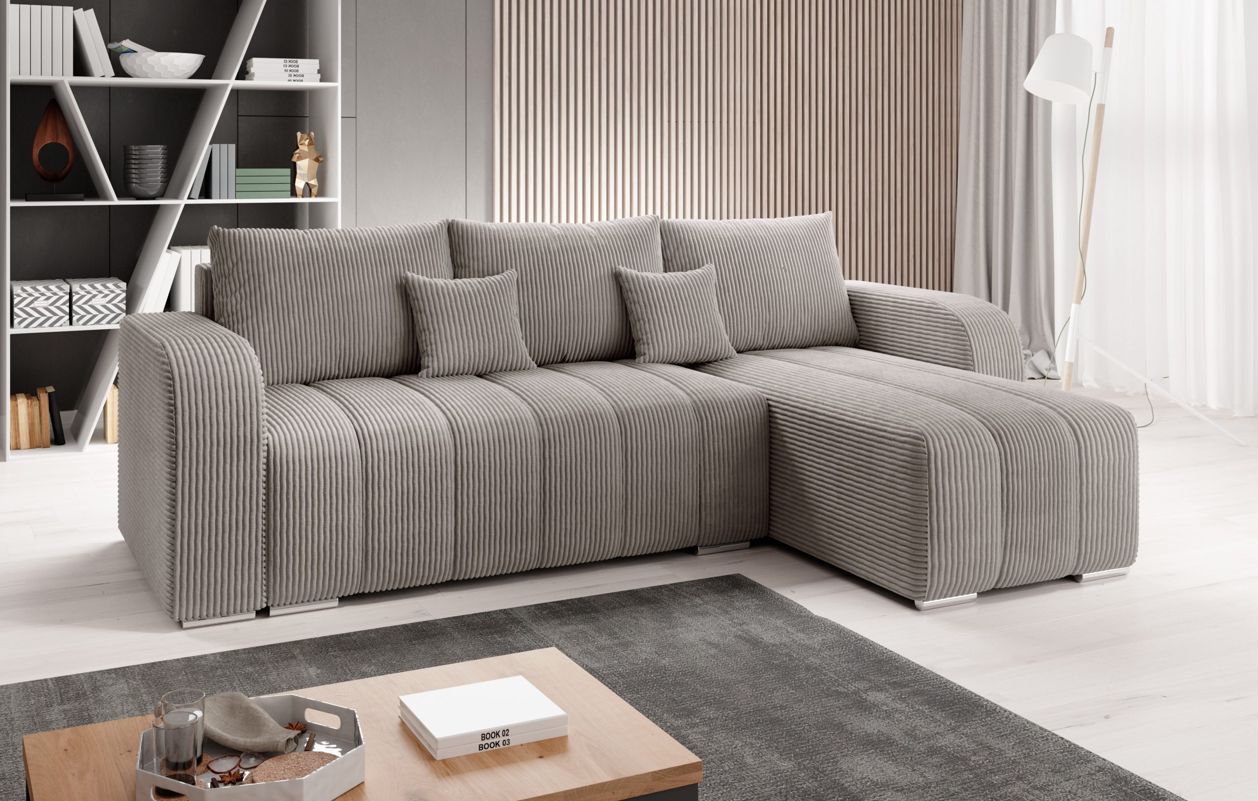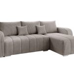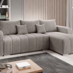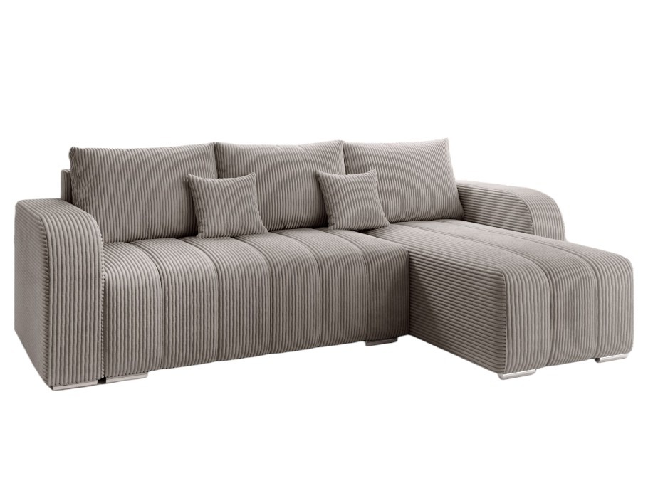 Jego L-kształtna bryła doskonale organizuje przestrzeń w salonie. Ciepły, beżowy odcień tkaniny wprowadza do wnętrza spokój i poczucie bezpieczeństwa. Dlatego mebel ten świetnie odnajdzie się w aranżacjach skandynawskich lub minimalistycznych. Sztruksowa tapicerka dodaje mu przytulnego charakteru, a chromowane nóżki subtelnie podkreślają nowoczesną linię. Co ważne, tapicerowany tył pozwala ustawić narożnik w dowolnym miejscu, nawet na środku pokoju.