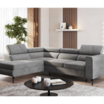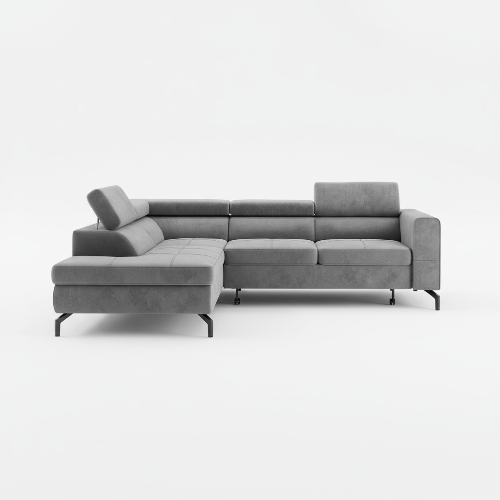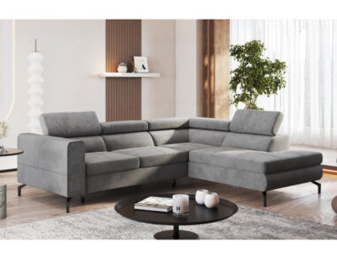 Jego nowoczesna, prosta linia zyskuje lekkość dzięki wysokim, czarnym nóżkom. Kształt litery L pozwala na wygodne zaaranżowanie przestrzeni. Neutralna szarość obicia tworzy we wnętrzu spokojną, elegancką atmosferę. Dlatego narożnik doskonale wpisuje się zarówno w minimalistyczne, jak i klasyczne aranżacje. Co ważne, tapicerowany tył mebla umożliwia ustawienie go w dowolnym miejscu, nawet na środku pokoju.