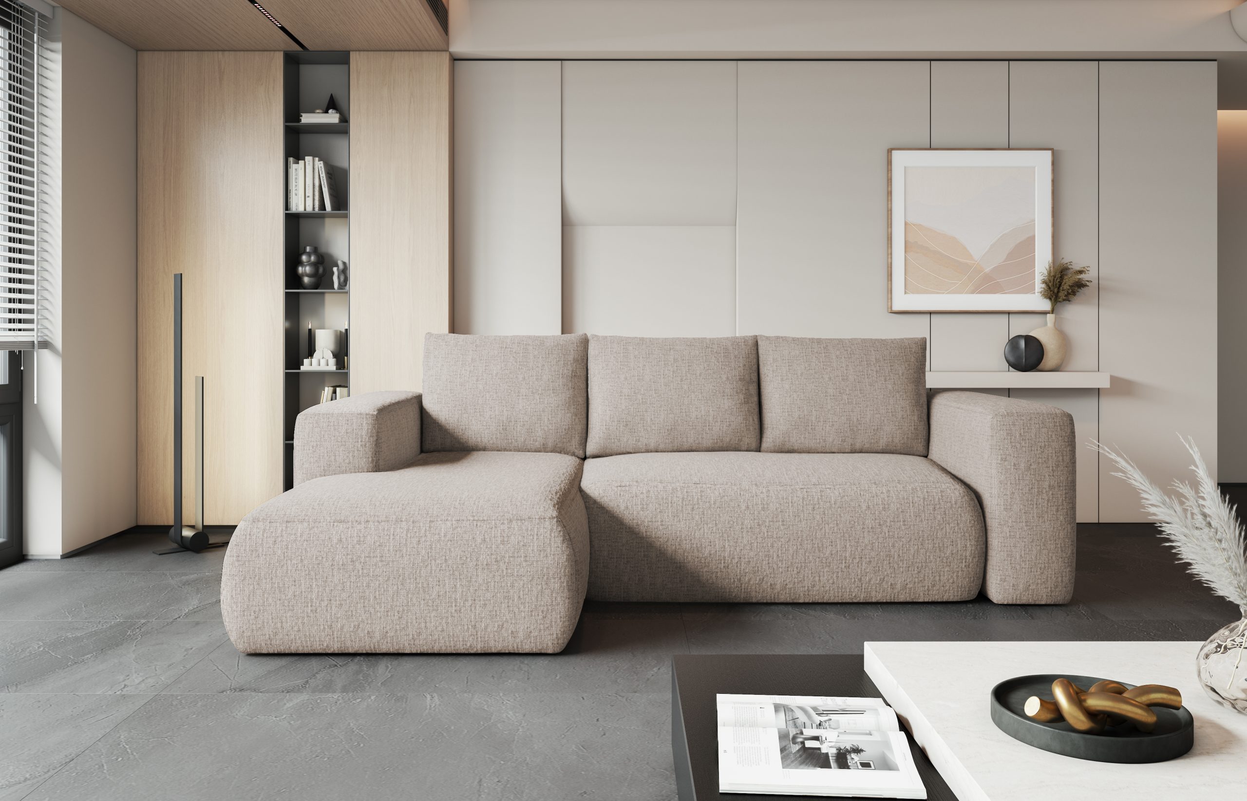 Delikatny beżowy narożnik Lambi sprawia, że wnętrze staje się bardziej przytulne i pełne światła. To mebel, który zaprasza do odpoczynku i tworzy ciepłą, domową atmosferę każdego dnia.