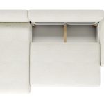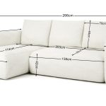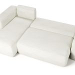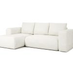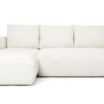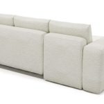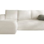 Jego przemyślany kształt litery L idealnie pasuje do nowoczesnych i artystycznych wnętrz w stylu boho. Tapicerowany tył pozwala swobodnie ustawić mebel na środku pokoju. W ten sposób staje się on centralnym punktem aranżacji. Jasna, neutralna barwa tapicerki rozświetla przestrzeń. Wprowadza do niej atmosferę spokoju i naturalności. Niskie, czarne nóżki dodają całości subtelnej elegancji.