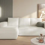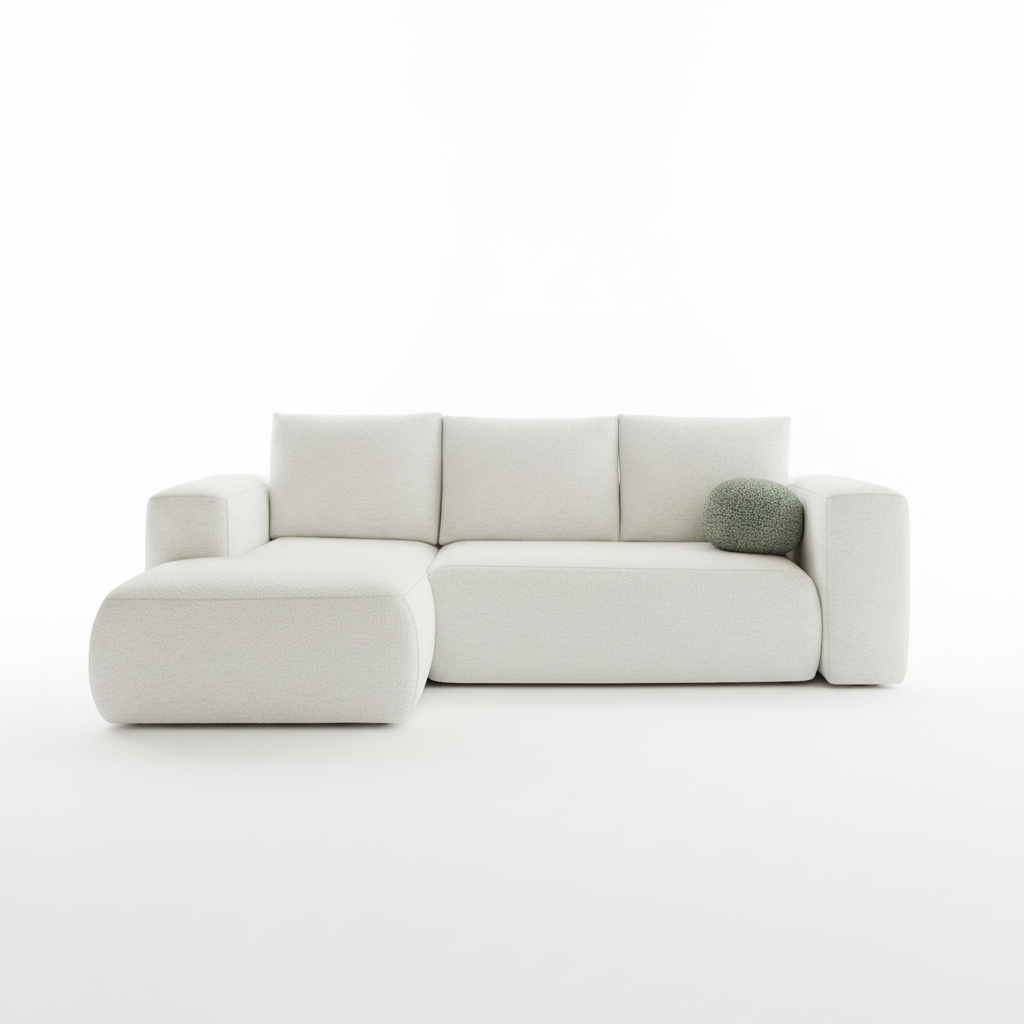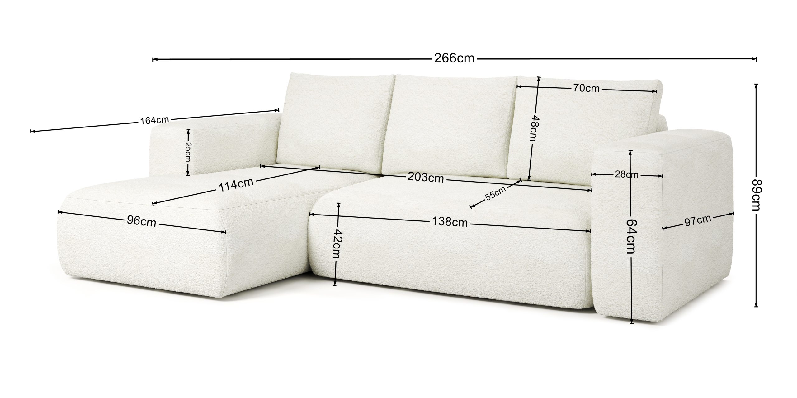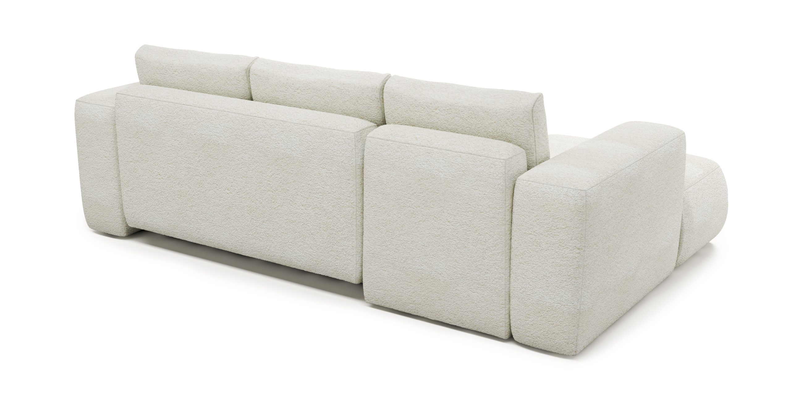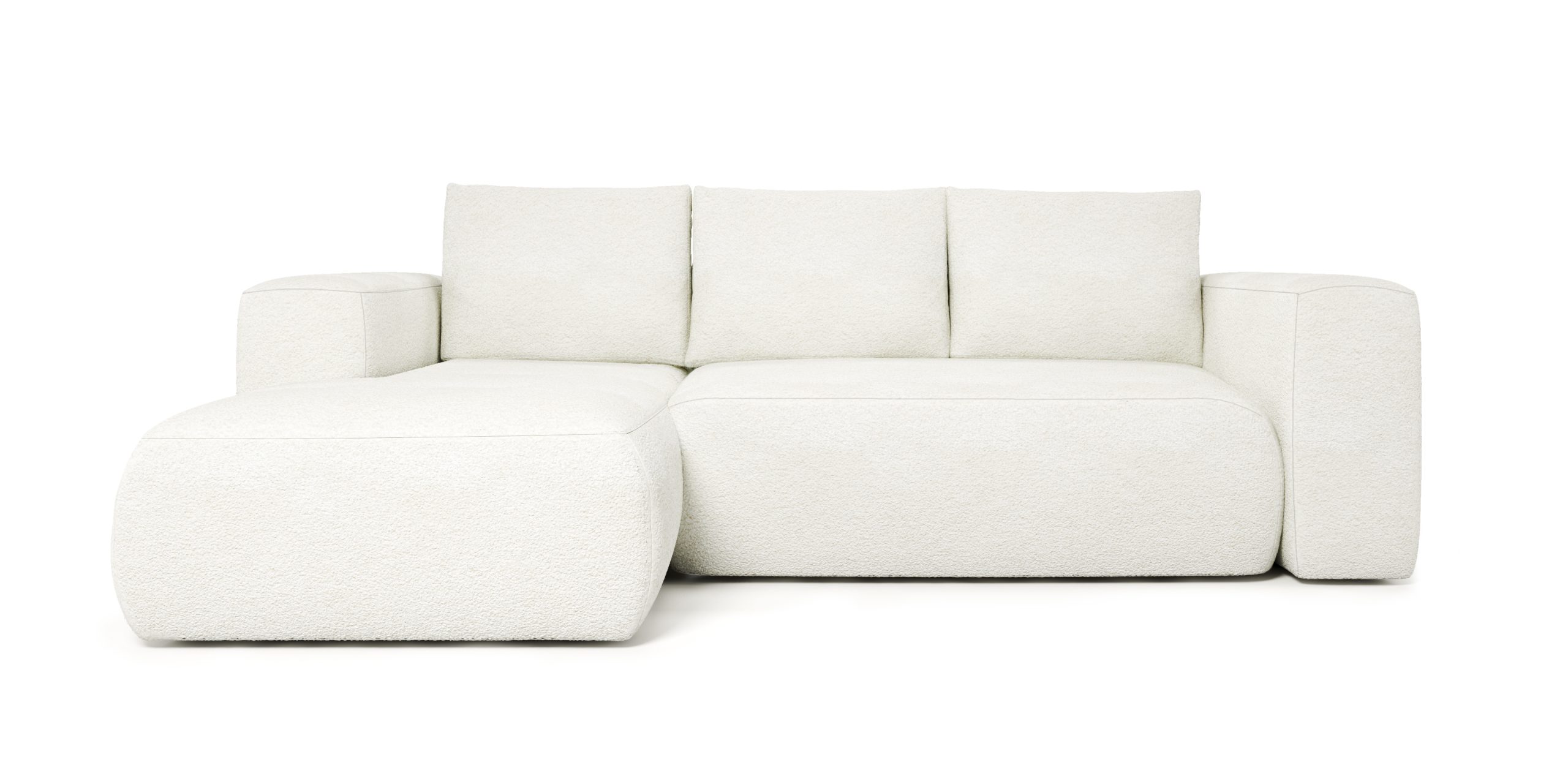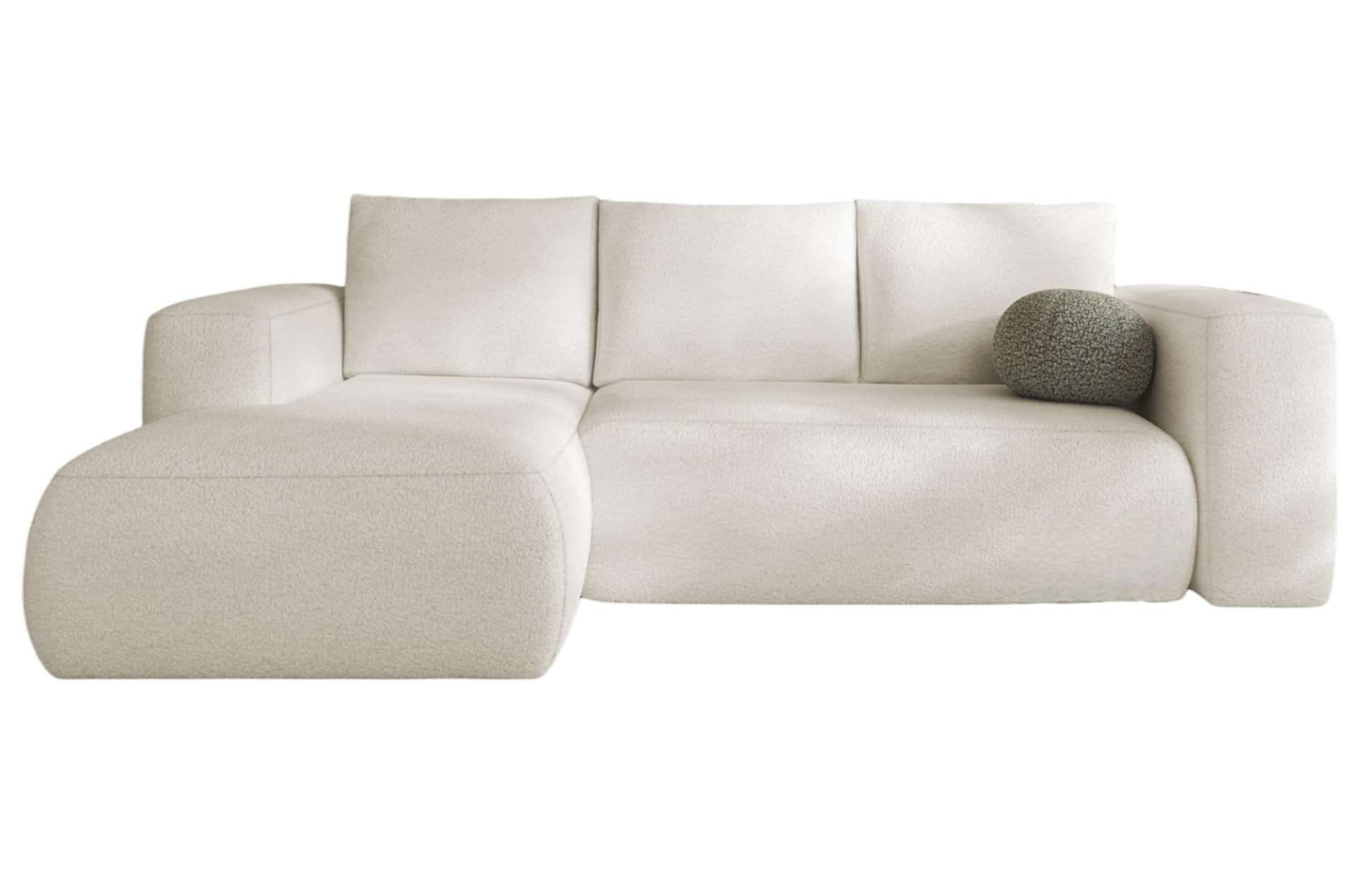 Szlachetna tkanina boucle odznacza się pięknem i wyjątkową funkcjonalnością. Co ważne, materiał jest przyjazny zwierzętom. Pozwala to cieszyć się wspólnymi chwilami z psem lub kotem bez obaw o zaciągnięcia. Specjalna powłoka utrudnia wchłanianie rozlanych płynów. Z kolei funkcja łatwego czyszczenia wodą sprawia, że utrzymanie sofy w czystości jest bardzo proste. Beżowy narożnik Lambi to zatem wybór świadomy i praktyczny.