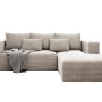 Jego nowoczesny design w kształcie litery L doskonale organizuje przestrzeń w salonie. Wyraźna faktura materiału Poso nadaje mu przytulnego charakteru. Kremowy odcień tapicerki subtelnie rozjaśnia wnętrze. Dlatego mebel staje się spokojną bazą dla wielu aranżacji, od skandynawskich po klasyczne. Wprowadza do domu atmosferę ciepła i wizualnej lekkości.