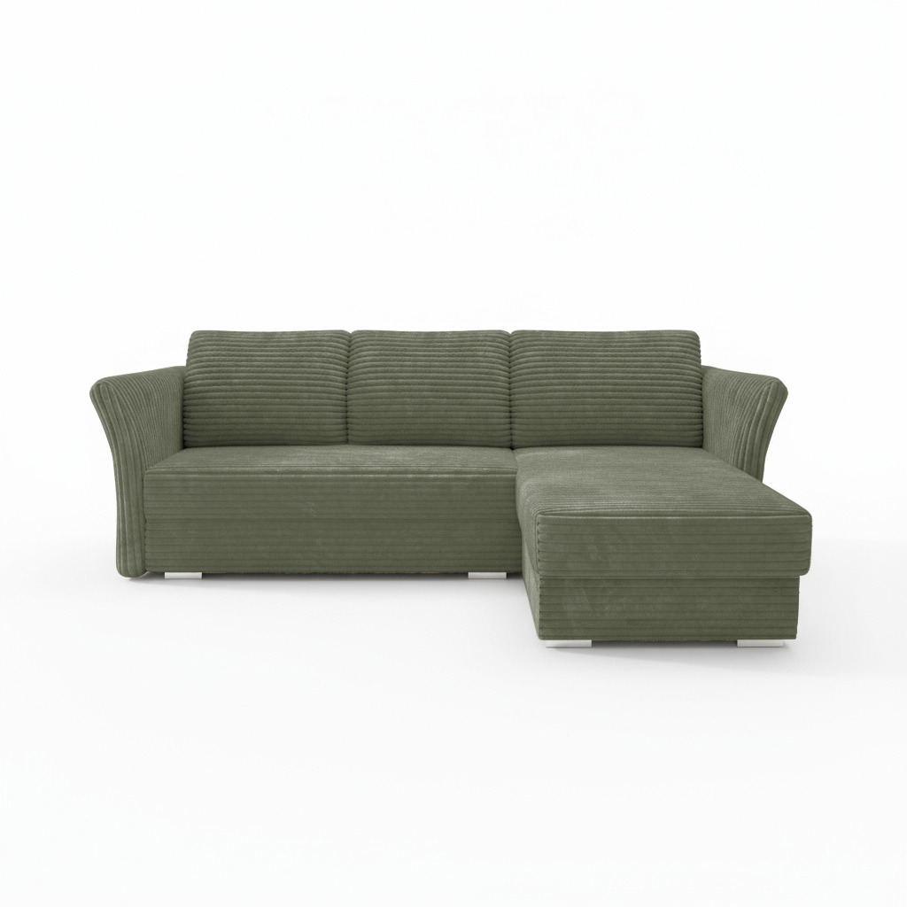 Mebel ma praktyczny kształt litery L. Dzięki temu idealnie wpasowuje się w róg pokoju lub wyznacza strefę wypoczynkową w otwartej przestrzeni. Głęboki odcień zieleni wprowadza do salonu atmosferę spokoju inspirowaną naturą. Kolor ten doskonale wygląda w otoczeniu drewna, beżu i bieli, tworząc przytulne wnętrze. Całość wspiera się na niskich, chromowanych nóżkach, które dodają konstrukcji subtelnej elegancji. Co ważne, tapicerowany tył pozwala ustawić narożnik w dowolnym miejscu.