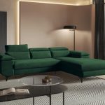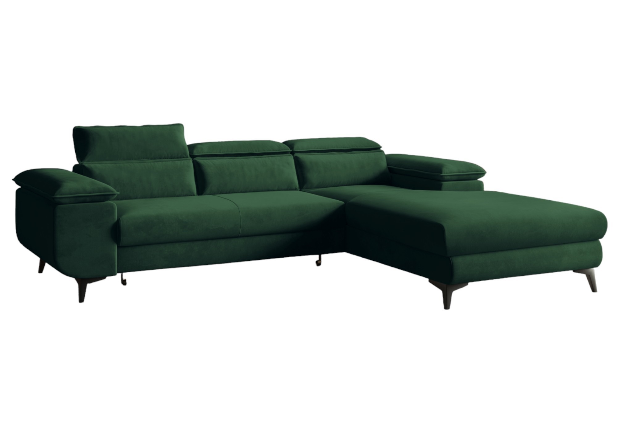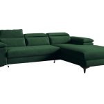 Jego przemyślany kształt litery L tworzy przytulną strefę wypoczynku w sercu salonu. Głęboka, butelkowa zieleń nadaje wnętrzu atmosferę spokoju i elegancji. Dlatego ten odcień doskonale współgra z naturalnym drewnem, złotem oraz czarnymi akcentami. Wysokie, czarne nóżki z metalu nadają całej bryle lekkości i nowoczesnego charakteru. Co ważne, tapicerowany tył mebla pozwala na dowolne ustawienie go w pokoju, nawet na środku.