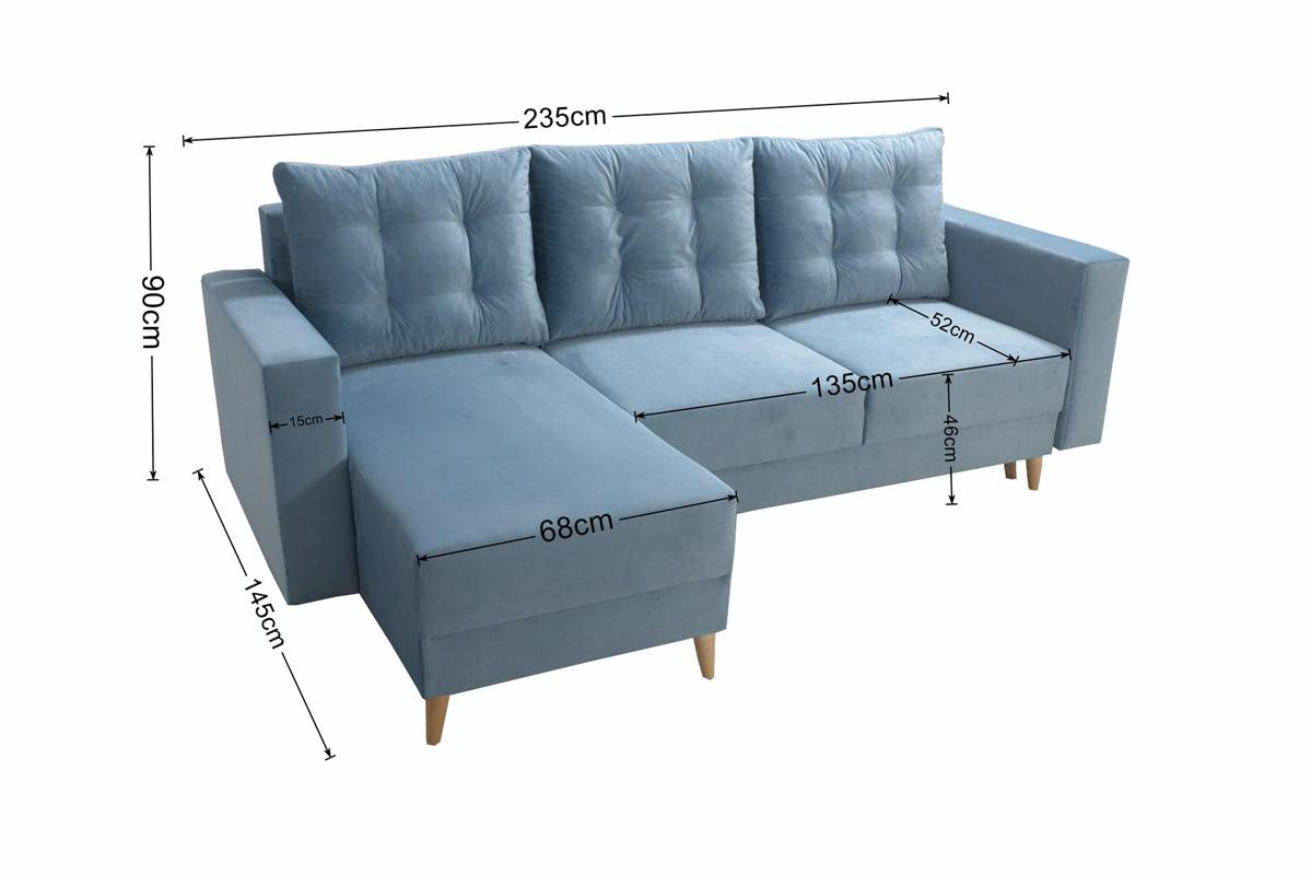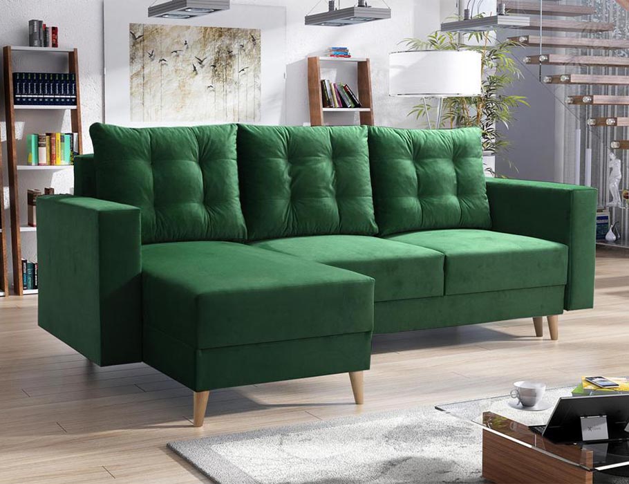 Model w kształcie litery L doskonale wpisuje się w aranżacje skandynawskie oraz klasyczne. Wysokie nóżki z naturalnego drewna bukowego dodają całej konstrukcji wizualnej lekkości. Kolor butelkowej zieleni wprowadza do salonu atmosferę spokoju i głębi. Dlatego wnętrze staje się przytulną oazą, idealną do wyciszenia po długim dniu. Co ważne, tapicerowany tył mebla pozwala na swobodne ustawienie go w centralnym punkcie pokoju.