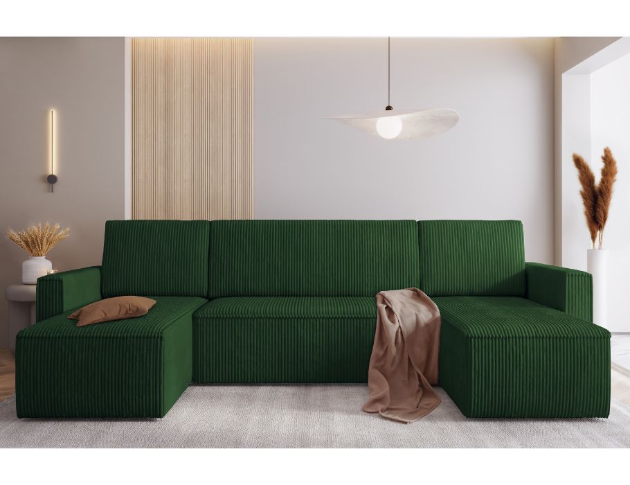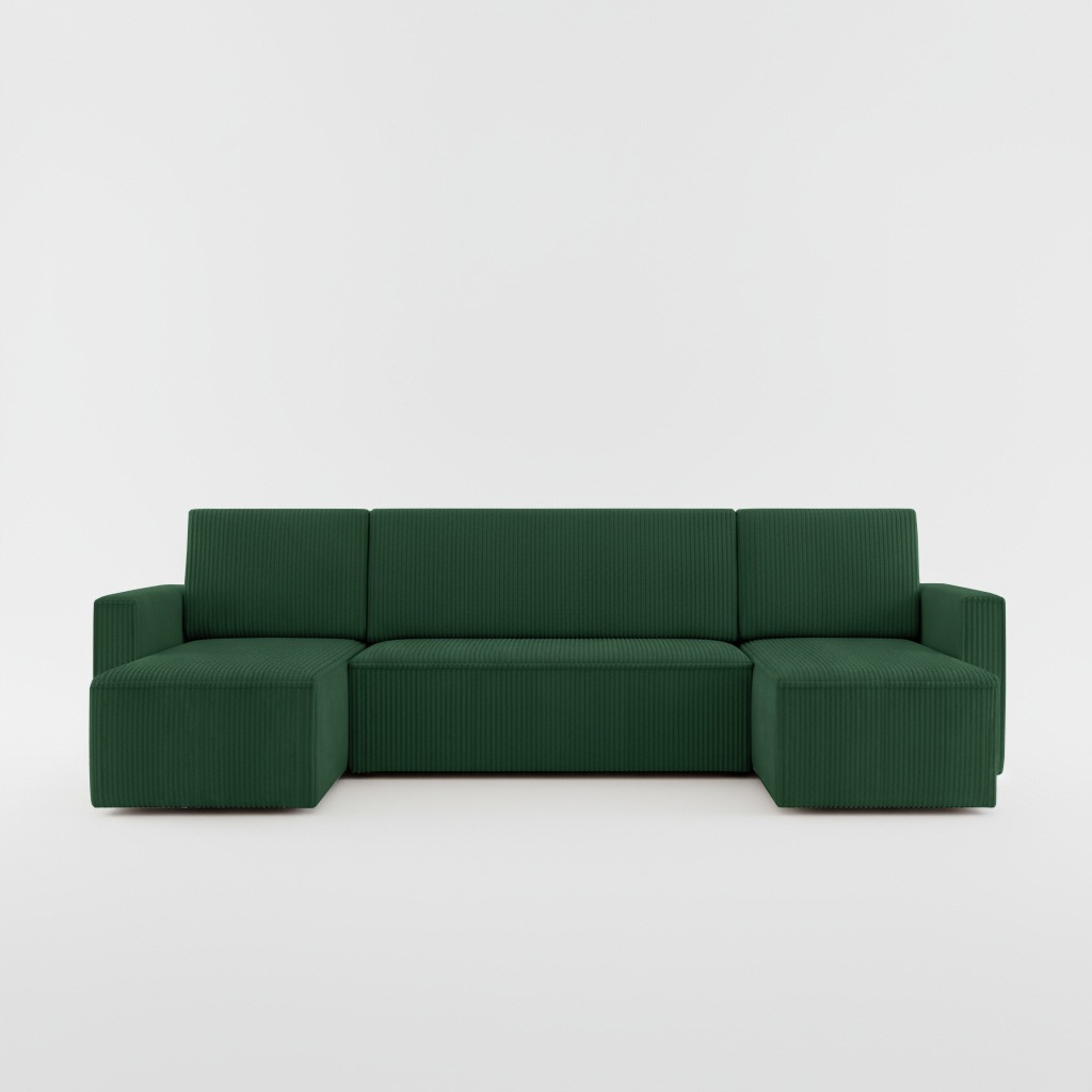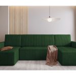 Jego symetryczny kształt w formie litery U tworzy idealne miejsce do spotkań w sercu salonu. Głęboki odcień butelkowej zieleni wprowadza do wnętrza elegancję oraz atmosferę spokoju. Taka barwa doskonale komponuje się zarówno z klasycznymi, jak i nowoczesnymi aranżacjami. Dzięki niej pomieszczenie nabiera wyrazistego charakteru i staje się bardziej przytulne.