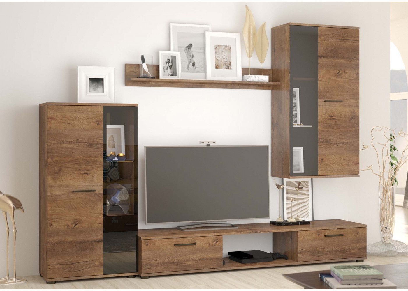 Dwie witryny oraz półka wisząca zapewniają obfite miejsce do przechowywania. Korpus meblościanki wykonany jest z grubej i sztywnej laminowanej płyty, z obrzeżem z melaminy, co gwarantuje trwałość i stabilność. Fronty natomiast zostały wykonane z płyty MDF o grubości 16 mm, co dodaje meblowi solidności.