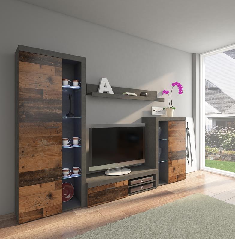 Nowoczesna meblościanka Rumba to wielofunkcyjne centrum w twoim domu, idealne do przechowywania, wyświetlania i organizacji. Składa się z kilku modułów, takich jak witryny, półka i stolik RTV, które zostały zaprojektowane w jednym spójnym stylu. W centralnej części meblościanki znajduje się miejsce na telewizor, umożliwiając stworzenie eleganckiego centrum rozrywki.