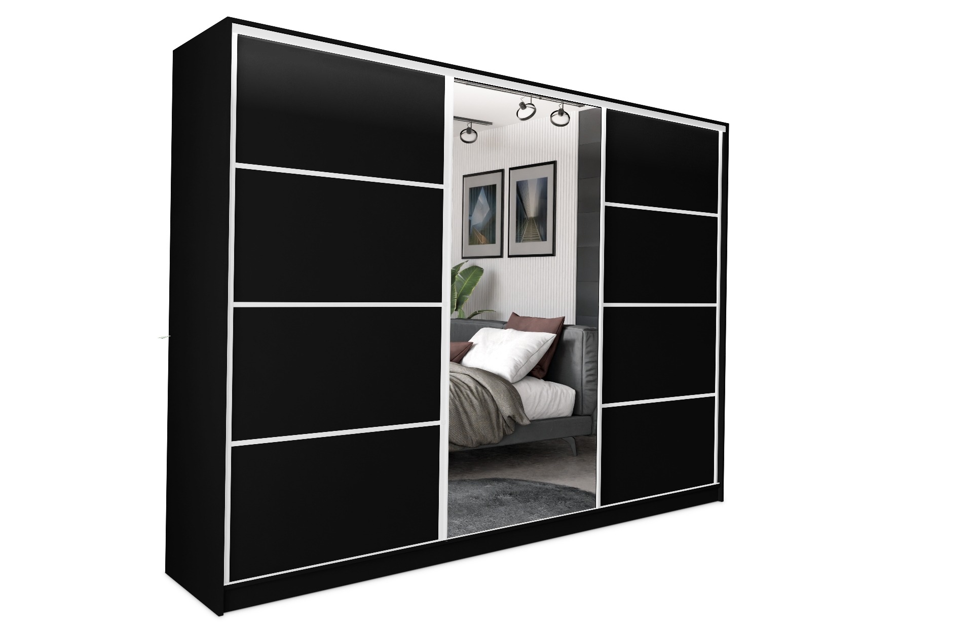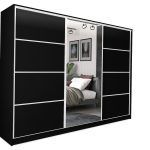 Czarna szafa VIP przesuwna z lustrem to elegancka i funkcjonalna opcja dla każdego wnętrza. Wykonana w nowoczesnym stylu, w kolorze głębokiej czerni, doskonale pasuje do współczesnych aranżacji. Przesuwne drzwi oszczędzają miejsce, co sprawia, że szafa idealnie sprawdzi się zarówno w mniejszych, jak i większych pomieszczeniach. Centralnie umieszczone lustro powiększa optycznie przestrzeń, a także dodaje elegancji.