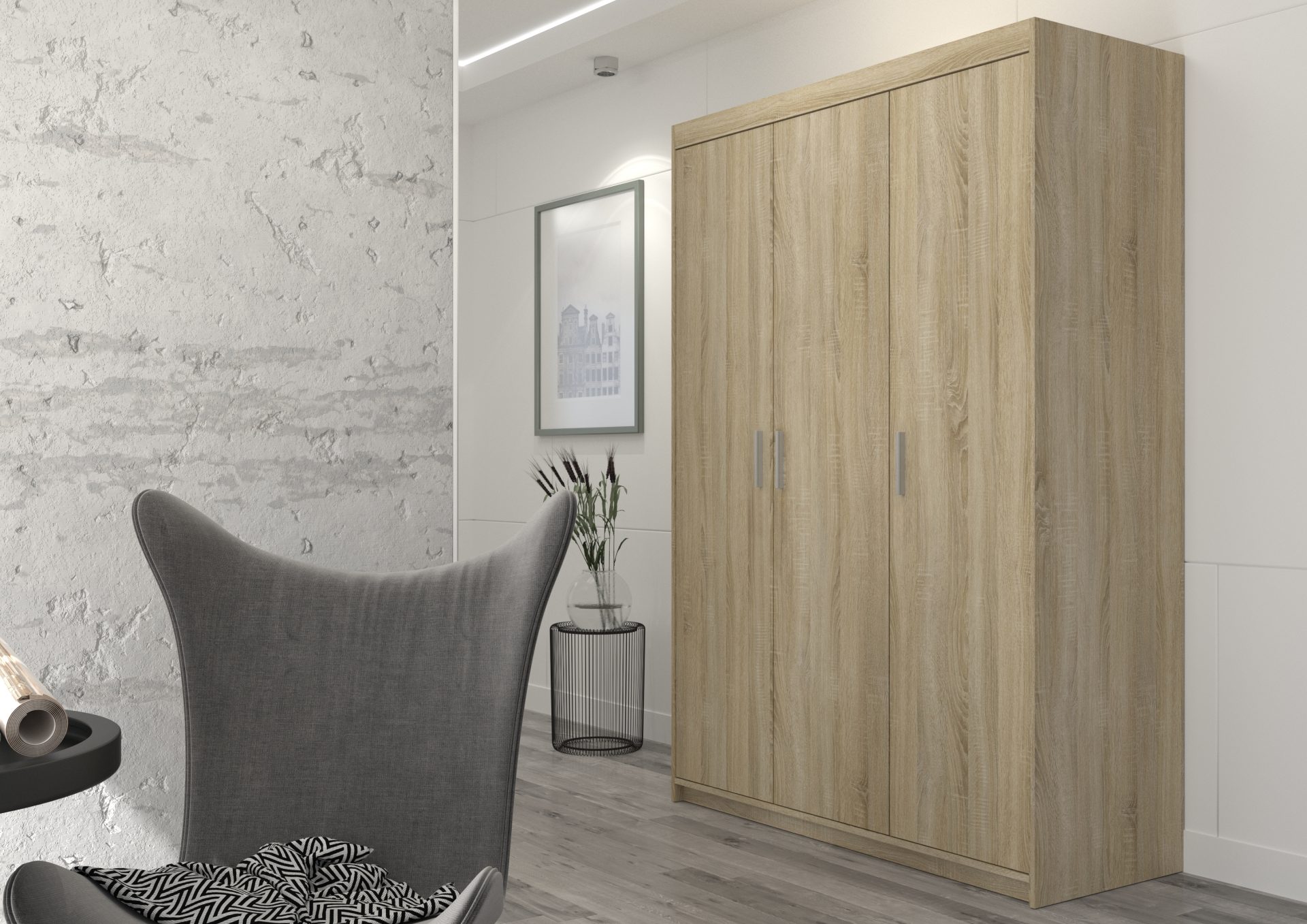 Szafa ELENA to doskonały wybór dla osób ceniących sobie funkcjonalność, elegancję i nowoczesny design. Jest to mebel wolnostojący, który dzięki starannemu wykonaniu i estetycznemu wyglądowi idealnie komponuje się z różnymi stylami wnętrz, zarówno klasycznymi, jak i nowoczesnymi. Szafa ELENA wyróżnia się trzema drzwiami, co zapewnia wygodny dostęp do wnętrza oraz umożliwia efektywne organizowanie przestrzeni.