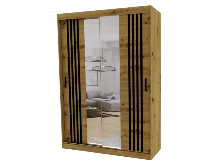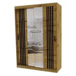 Fronty drzwi ozdobiono dekoracyjnymi, czarnymi lamelami, które dodają całości nowoczesnego, designerskiego charakteru. Szafę wyposażono również w dwa lustra – jedno po lewej i jedno po prawej stronie – co nie tylko podnosi walory użytkowe, ale również optycznie powiększa przestrzeń.