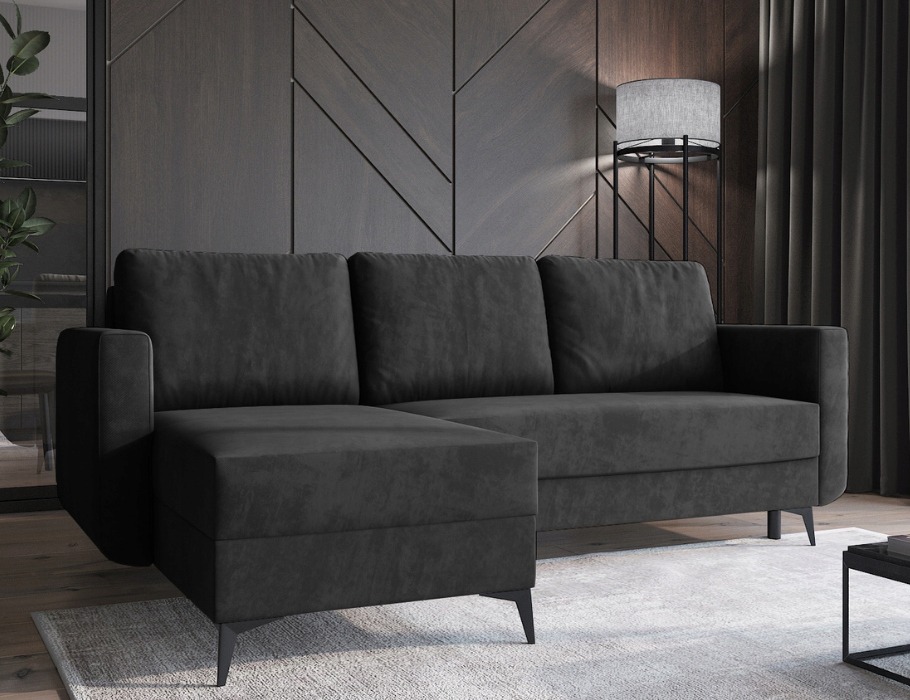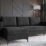 Jego klasyczna forma w kształcie litery L doskonale odnajduje się w różnych aranżacjach. Wysokie, czarne nóżki dodają mu wizualnej lekkości. Dzięki temu mebel wygląda niezwykle zgrabnie. Głęboki, grafitowy kolor tapicerki wprowadza do salonu atmosferę spokoju i elegancji. Stanowi on idealne tło dla kolorowych dodatków lub stonowanych, monochromatycznych kompozycji. Co ważne, tapicerowany tył pozwala na ustawienie narożnika w dowolnym miejscu. Może on stanąć na środku pokoju, subtelnie dzieląc przestrzeń.