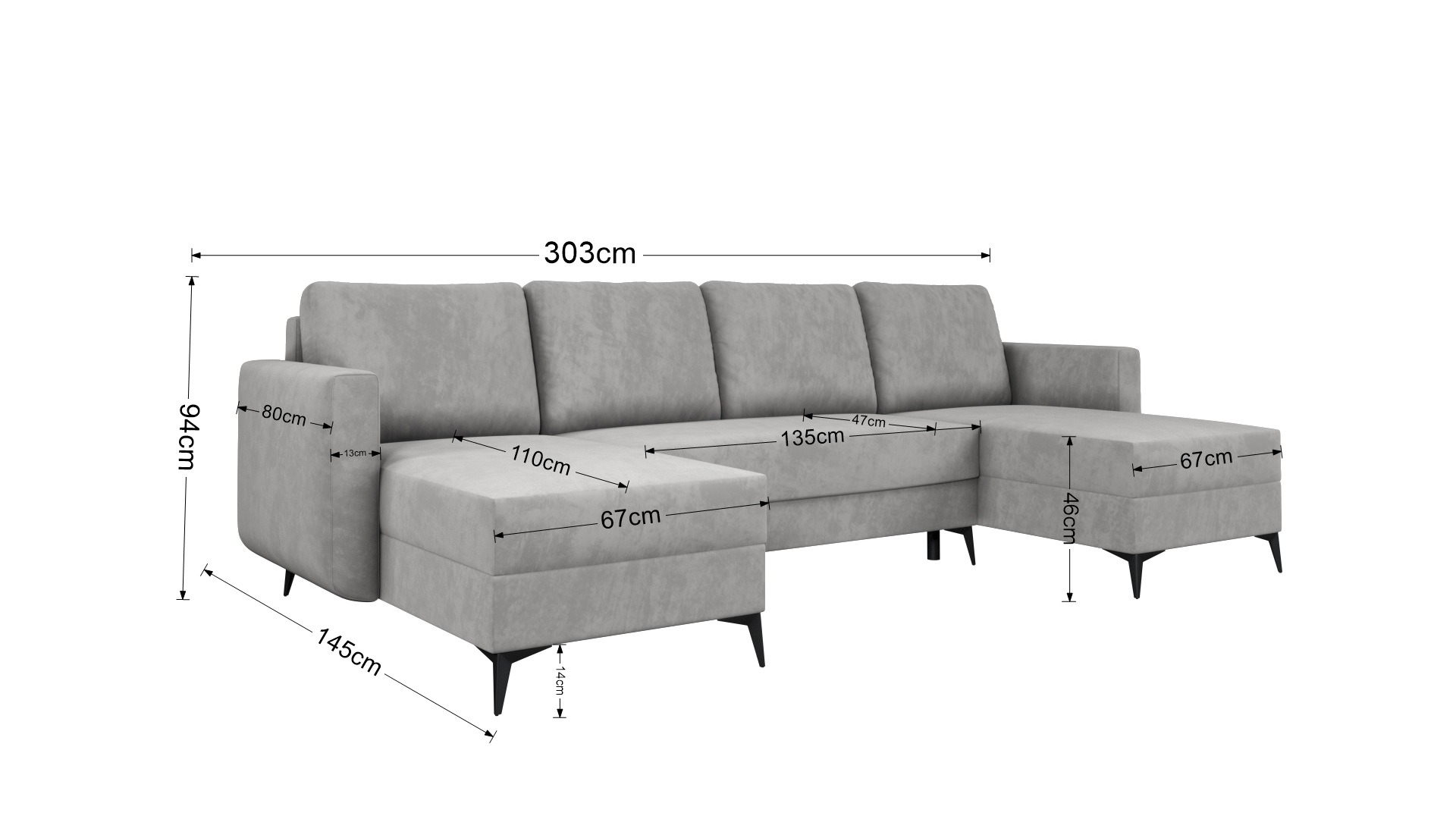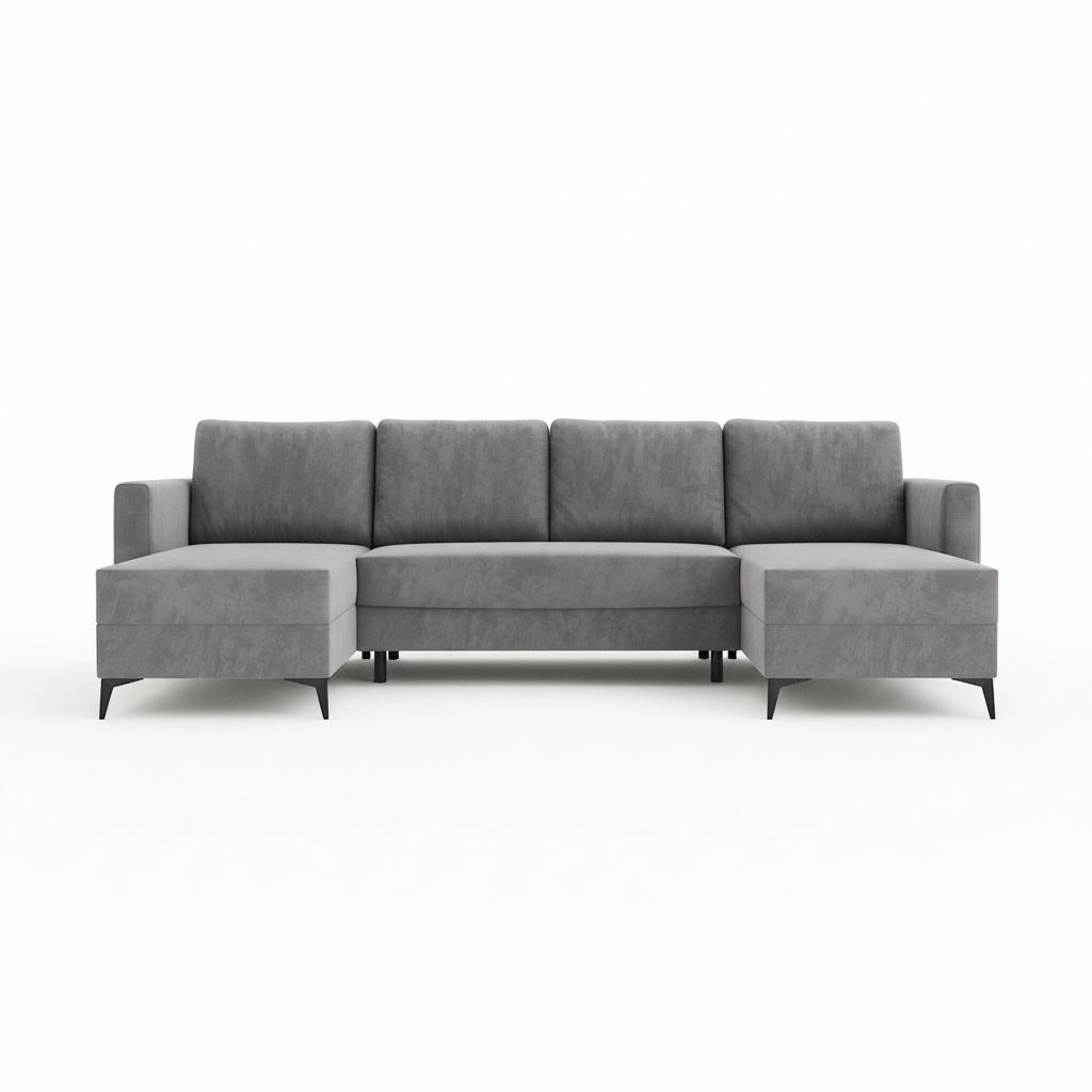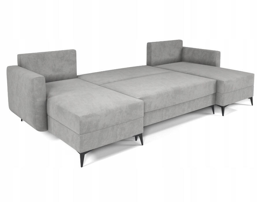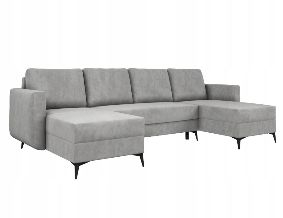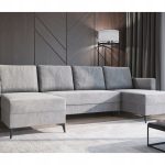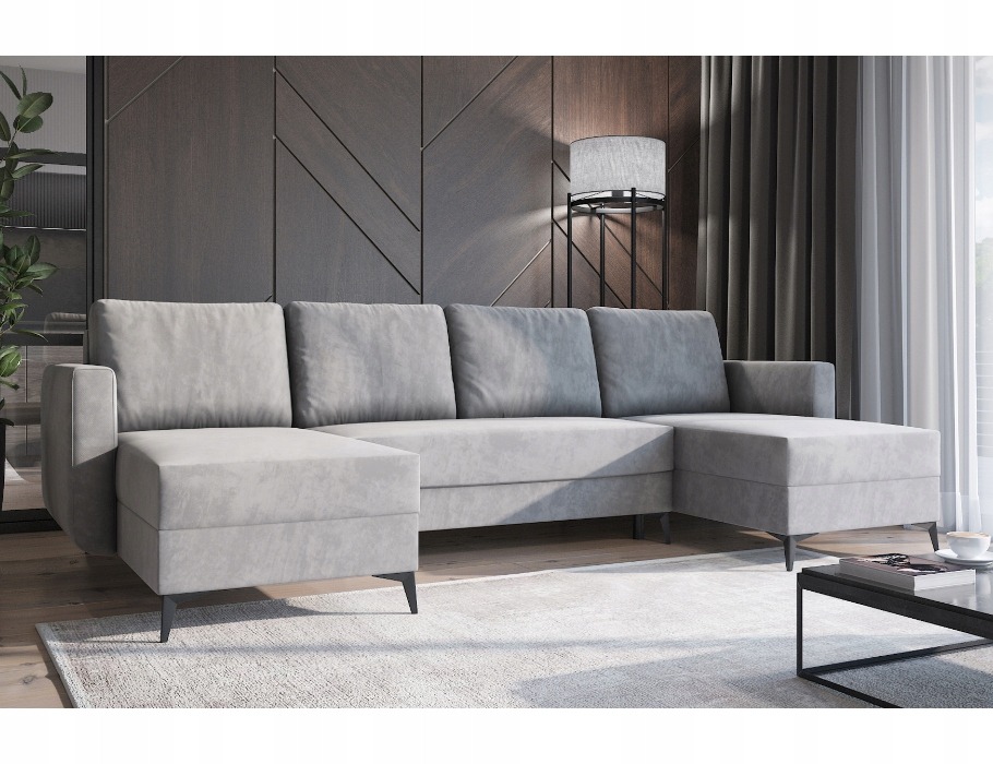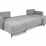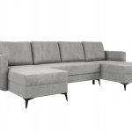 Jego symetryczna forma tworzy w salonie przytulną strefę spotkań dla całej rodziny. Szary kolor tapicerki wprowadza do wnętrza spokój i ponadczasową elegancję. Dzięki temu odcień łatwo dopasować do aranżacji nowoczesnych oraz bardziej klasycznych. Wysokie, czarne nóżki dodają całej konstrukcji wizualnej lekkości. Co ważne, tapicerowany tył pozwala ustawić mebel w dowolnym miejscu pomieszczenia. Narożnik może stanąć na środku pokoju, stając się jego centralnym punktem.