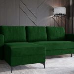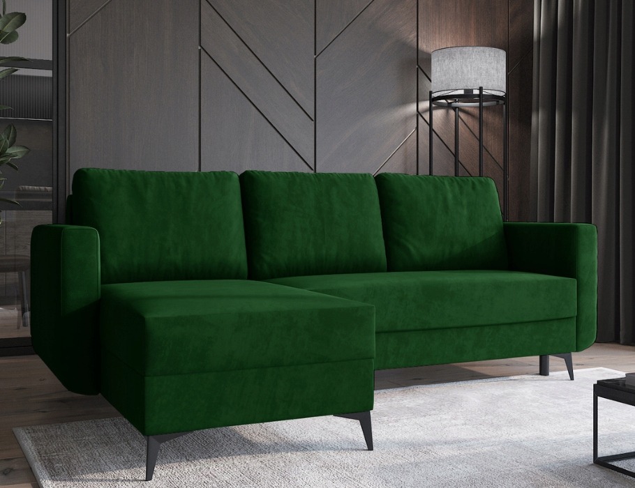 Jego sylwetka w kształcie litery L doskonale odnajduje się w różnych aranżacjach. Pasuje zarówno do wnętrz nowoczesnych, jak i tych inspirowanych klasyką. Szlachetny odcień butelkowej zieleni nadaje salonowi głębi i przytulnego charakteru. Tworzy atmosferę sprzyjającą wyciszeniu. Wysokie, czarne nóżki dodają konstrukcji wizualnej lekkości. Co ważne, tapicerowany tył pozwala ustawić mebel w dowolnym miejscu pokoju.