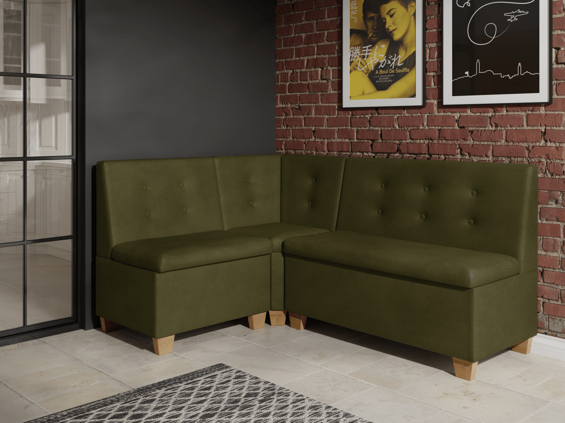 Praktyczne schowki pod siedziskiem pomogą Ci zorganizować miejsce na drobiazgi lub tekstylia kuchenne. Wysokiej jakości pianka T30 gwarantuje komfort siedzenia i trwałość na lata. Barcelona to mebel wolnostojący — tył został starannie obity tkaniną, co pozwala ustawić go w dowolnym miejscu kuchni czy jadalni.