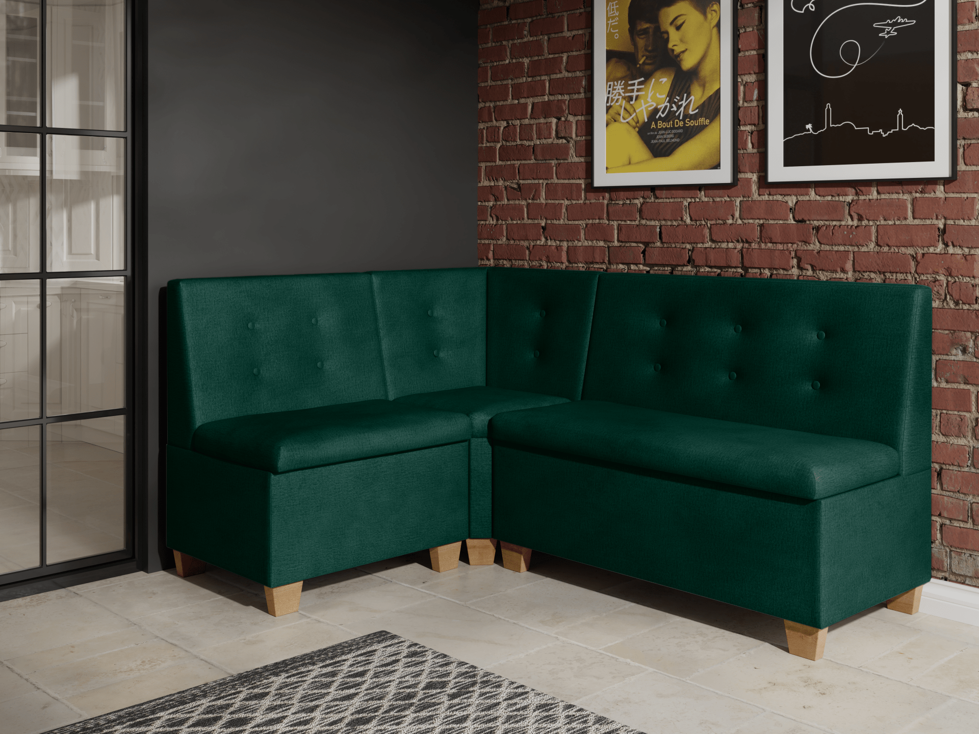 Praktyczne schowki pod siedziskiem pomogą Ci zorganizować miejsce na drobiazgi lub tekstylia kuchenne. Wysokiej jakości pianka T30 gwarantuje komfort siedzenia i trwałość na lata. Barcelona to mebel wolnostojący — tył został starannie obity tkaniną, co pozwala ustawić go w dowolnym miejscu kuchni czy jadalni.
