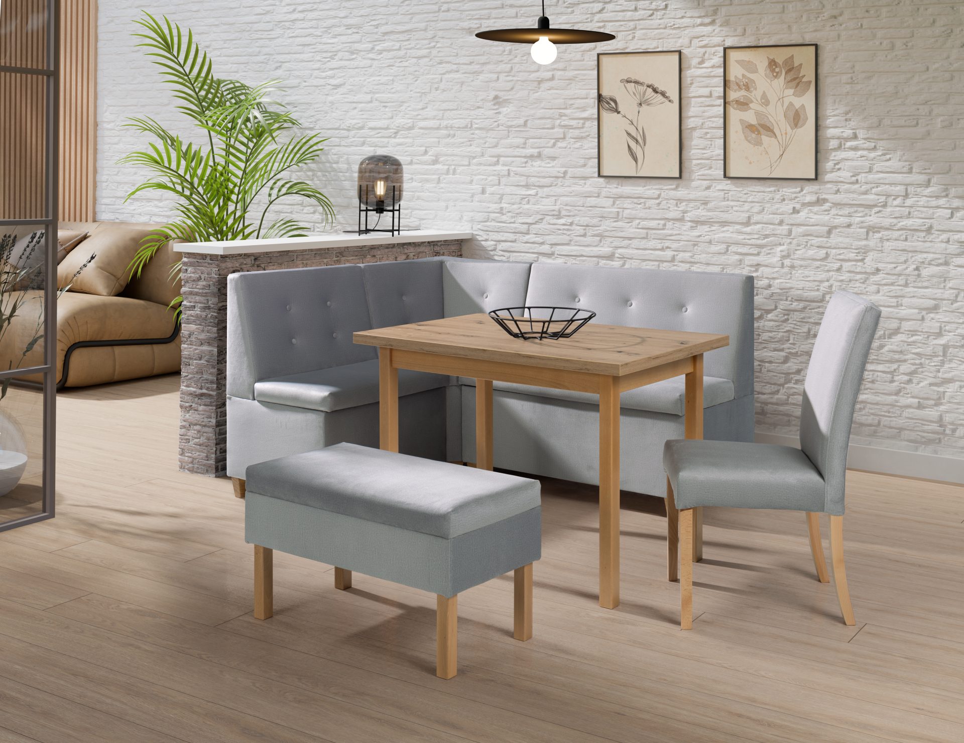 Zestaw mebli kuchennych, tapicerowanych luksusową tkaniną Monolith (welur), to nie tylko funkcjonalne, ale również wyjątkowo stylowe rozwiązanie, które idealnie łączy estetykę z komfortem. W skład tego przemyślanego zestawu wchodzą narożnik, stół, jedno krzesełko oraz praktyczna ławka . Wszystkie te elementy razem tworzą harmonijną kompozycję, która doskonale sprawdzi się zarówno w nowoczesnej kuchni, jak i w przytulnej jadalni, oferując nie tylko wygodę, ale i elegancki wygląd.