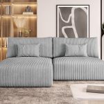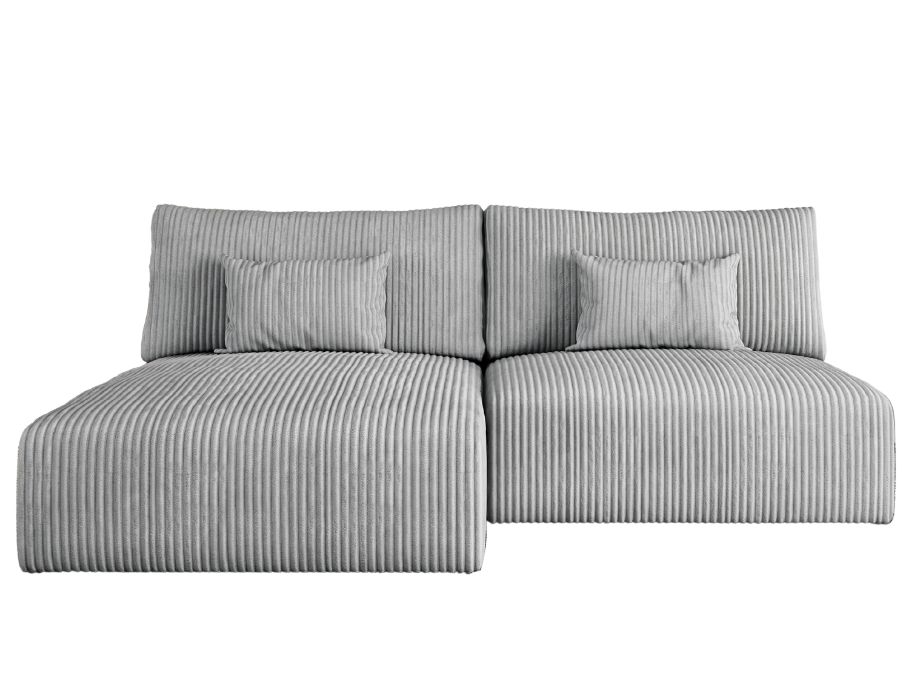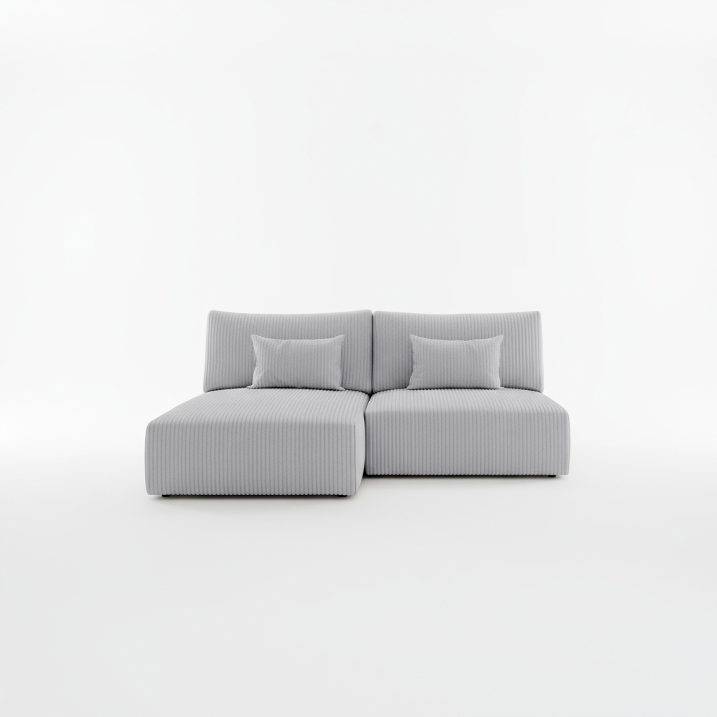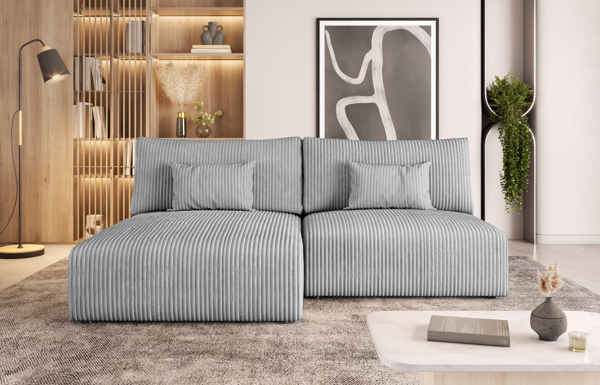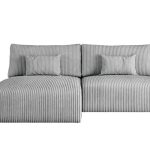 Jego nowoczesna forma w kształcie litery L doskonale komponuje się ze współczesnymi wnętrzami. Uniwersalny szary kolor wnosi do salonu spokój i ponadczasową klasę. Stanowi idealne tło dla kolorowych poduszek lub stonowanych, minimalistycznych dodatków. Sztruksowa faktura materiału dodaje całości wizualnej głębi i przytulnego charakteru. W ten sposób wnętrze staje się jednocześnie stylowe i ciepłe.