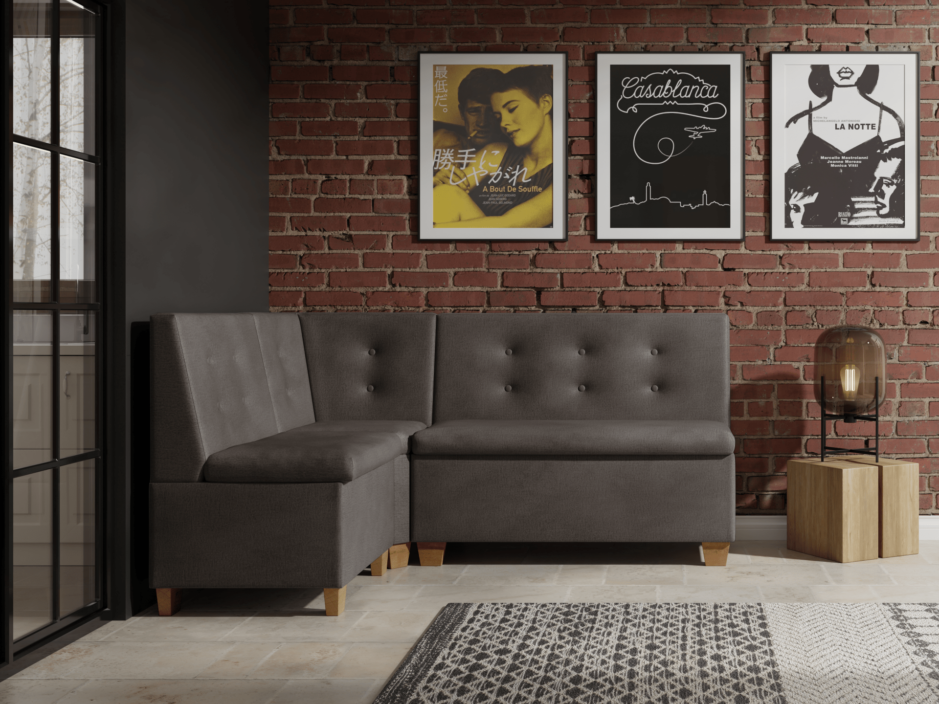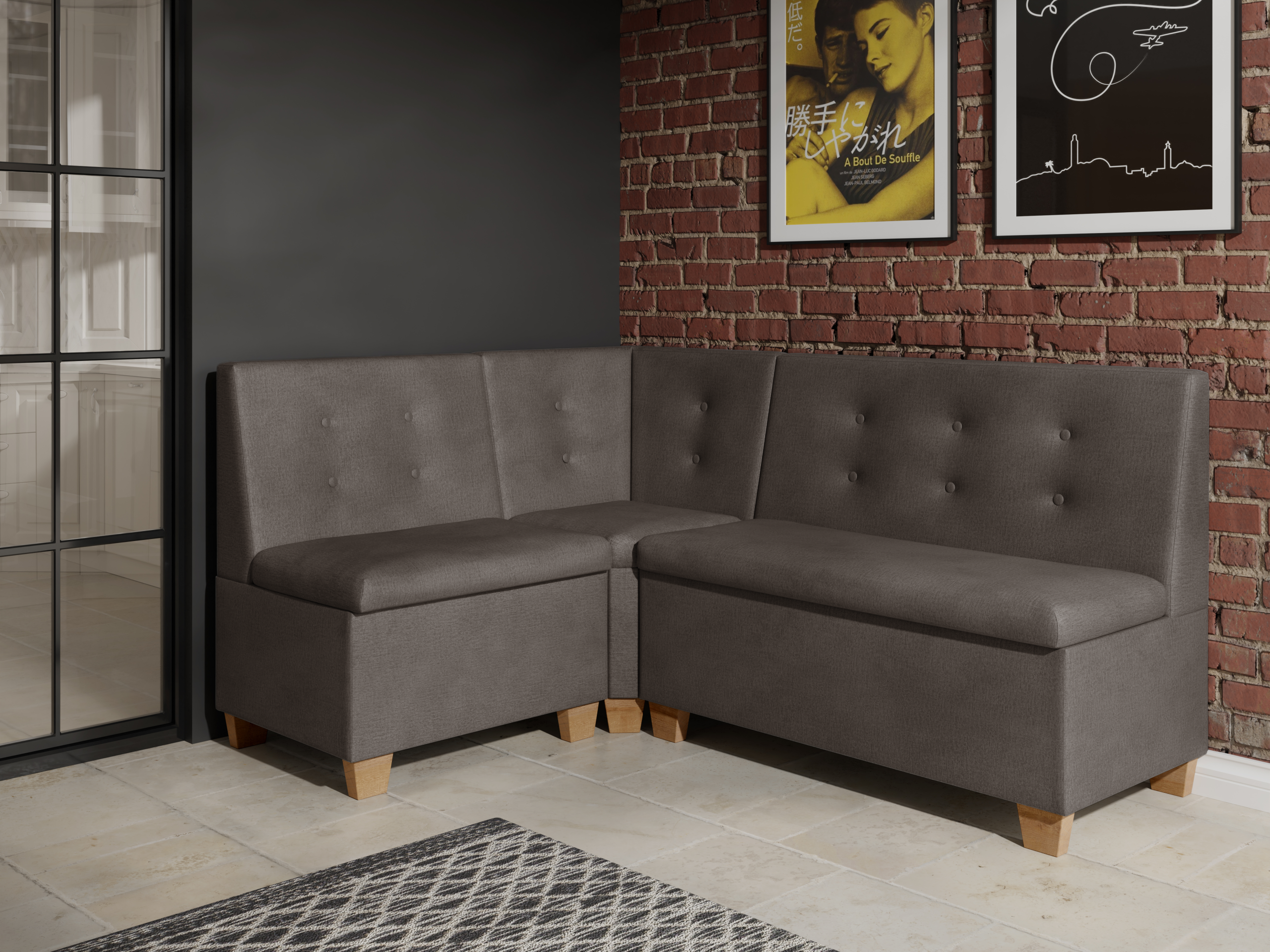 Praktyczne schowki pod siedziskiem pomogą Ci zorganizować miejsce na drobiazgi lub tekstylia kuchenne. Wysokiej jakości pianka T30 gwarantuje komfort siedzenia i trwałość na lata. Barcelona to mebel wolnostojący — tył został starannie obity tkaniną, co pozwala ustawić go w dowolnym miejscu kuchni czy jadalni.