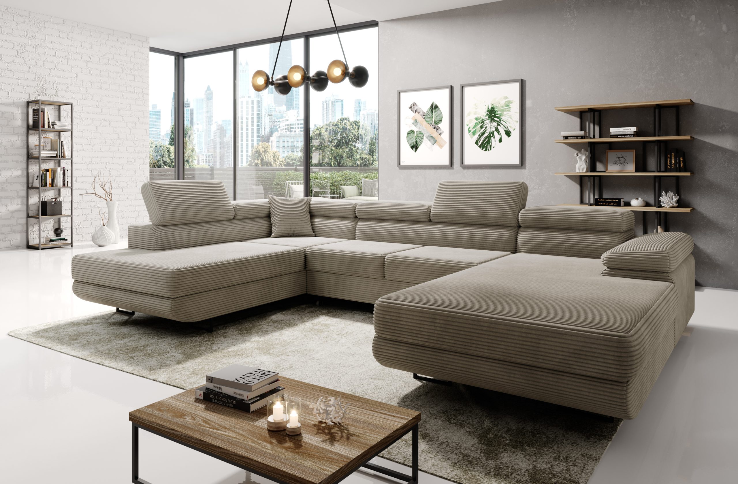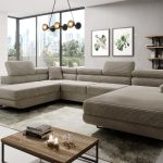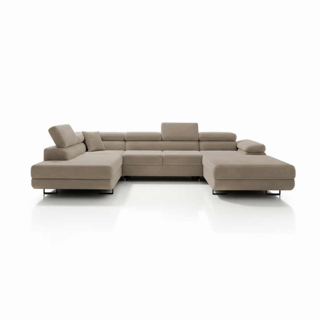 Jego imponujący kształt litery U tworzy przestronne centrum życia rodzinnego. Subtelny beżowy odcień wprowadza do wnętrza spokój i poczucie ciepła. Jasny kolor sprawia, że salon staje się przytulny oraz optycznie większy. Dlatego narożnik doskonale odnajdzie się w aranżacjach skandynawskich lub minimalistycznych. Całość osadzono na wysokich, czarnych nóżkach. Dodają one konstrukcji wizualnej lekkości.