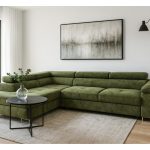 Mebel ma praktyczny układ w kształcie litery L. Wspiera się na wysokich, chromowanych nóżkach, które dodają konstrukcji wizualnej lekkości. Głęboki odcień khaki wprowadza do salonu atmosferę spokoju i bliskości natury. Dlatego narożnik doskonale pasuje do wnętrz nowoczesnych, skandynawskich oraz inspirowanych stylem boho. Co ważne, tapicerowany tył pozwala ustawić go w dowolnym miejscu, także na środku pokoju.