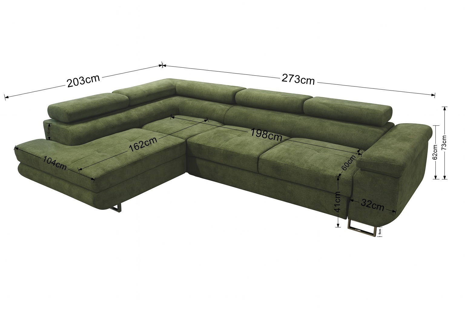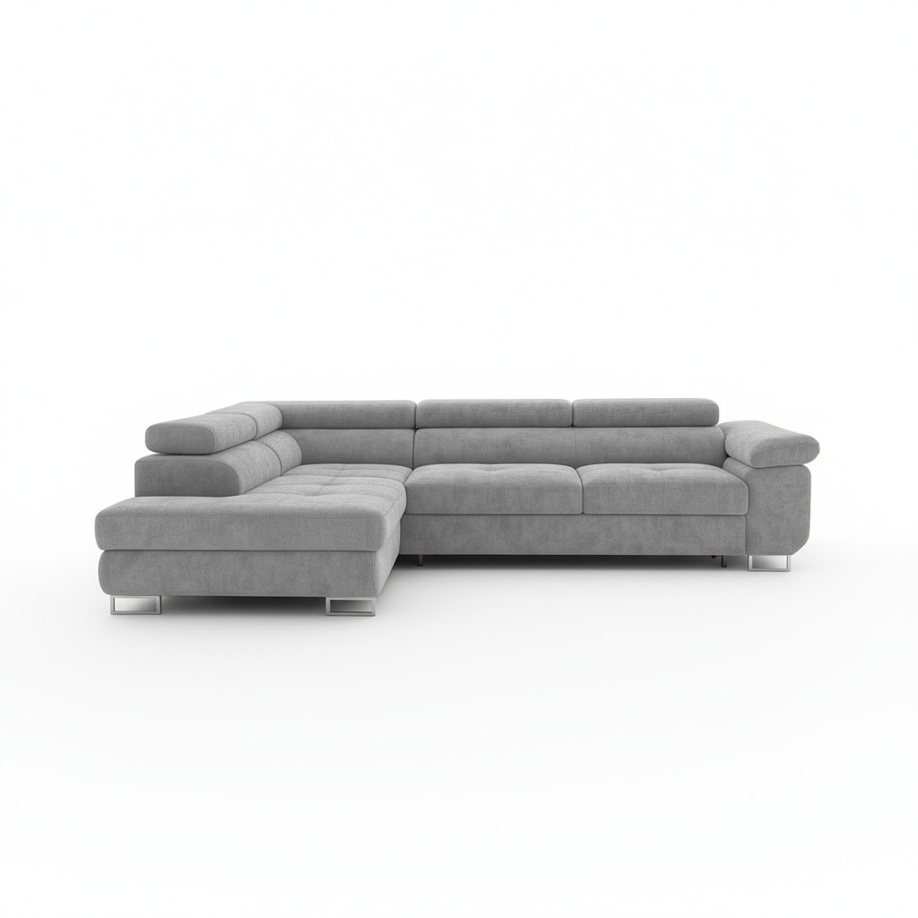 Jego układ w kształcie litery L naturalnie wydziela w pomieszczeniu strefę relaksu. Świetnie sprawdza się zarówno w rogu pokoju, jak i w jego centralnej części. Szlachetny, szary odcień tapicerki nadaje wnętrzu spokoju i klasy. Dlatego stanowi doskonałe tło dla wyrazistych dodatków lub stonowanych aranżacji. Całość osadzono na wysokich, chromowanych nóżkach. W ten sposób bryła zyskuje wizualną lekkość, a utrzymanie czystości pod meblem jest niezwykle proste.