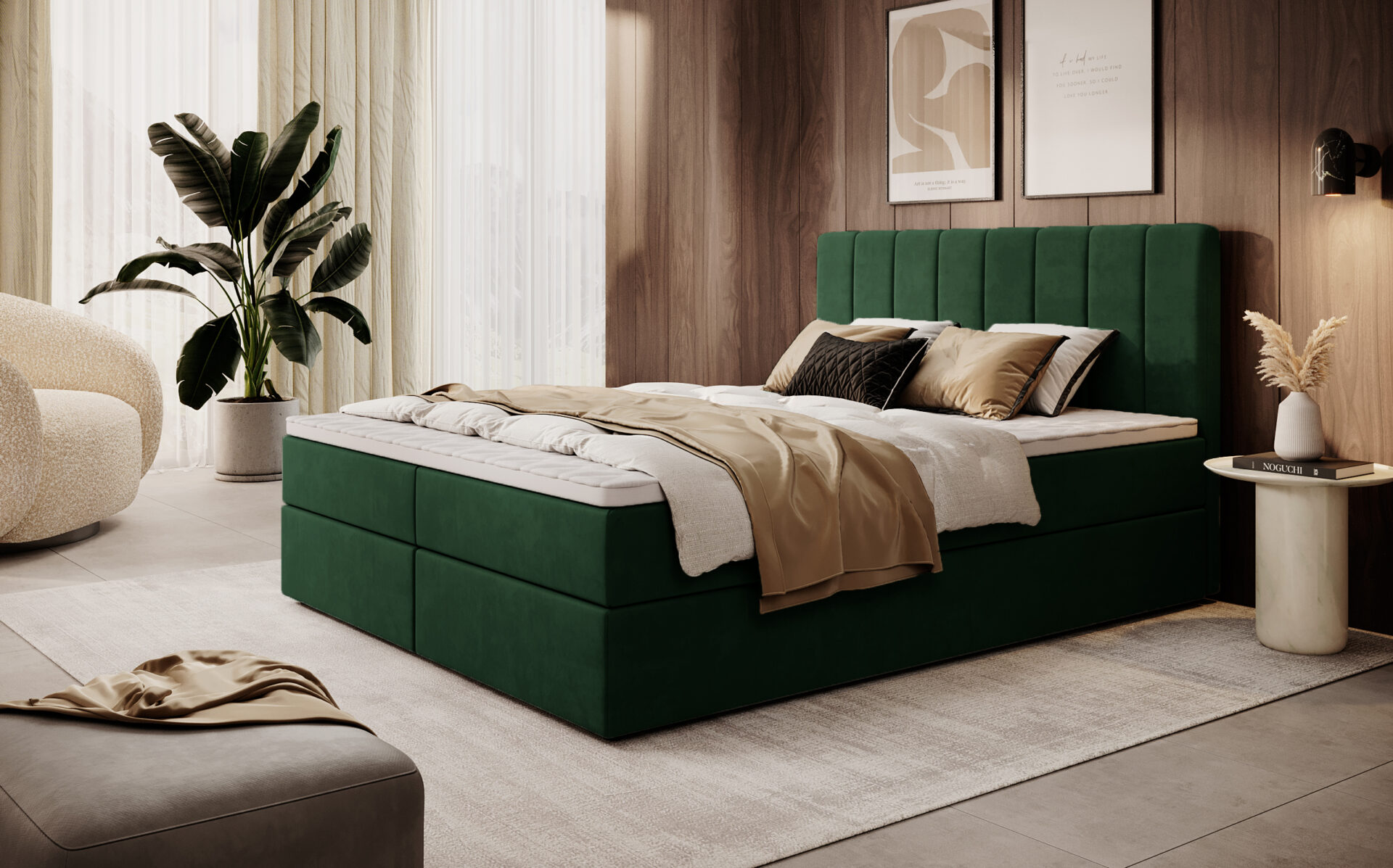 Aksamitne łóżko Alsta w odcieniu butelkowej zieleni wprowadza do sypialni wyrafinowany spokój. Jego design opiera się na prostocie, która doskonale odnajduje się zarówno w nowoczesnych, jak i klasycznych wnętrzach. Głęboki, butelkowy kolor tapicerki nadaje pomieszczeniu elegancji i przytulnego charakteru. W ten sposób sypialnia staje się stylowym azylem, idealnym miejscem na wieczorny odpoczynek. Welwetowa tkanina Monolith pięknie odbija światło, subtelnie podkreślając szlachetny odcień zieleni.