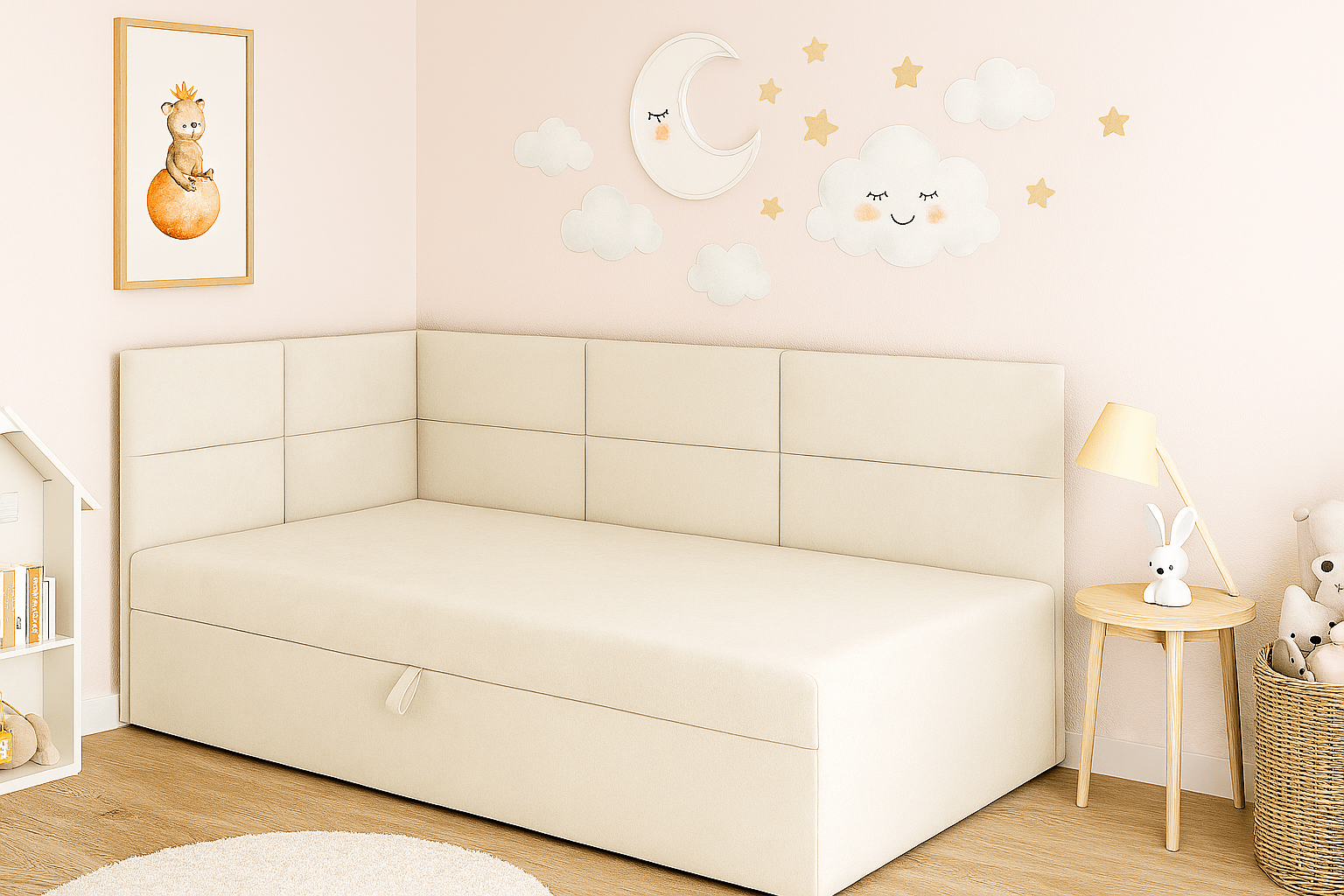 Łóżko zostało wyposażone w pojemny schowek na pościel, który ułatwia organizację przestrzeni. To świetne rozwiązanie, które pozwala zaoszczędzić miejsce w szafie i utrzymać porządek w pokoju dziecka lub gościnnej sypialni.