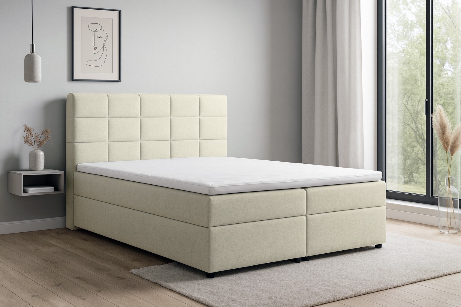 Łóżko kontynentalne Eris 160×200 – podwójne łóżko tapicerowane z pojemnikiem i topperem