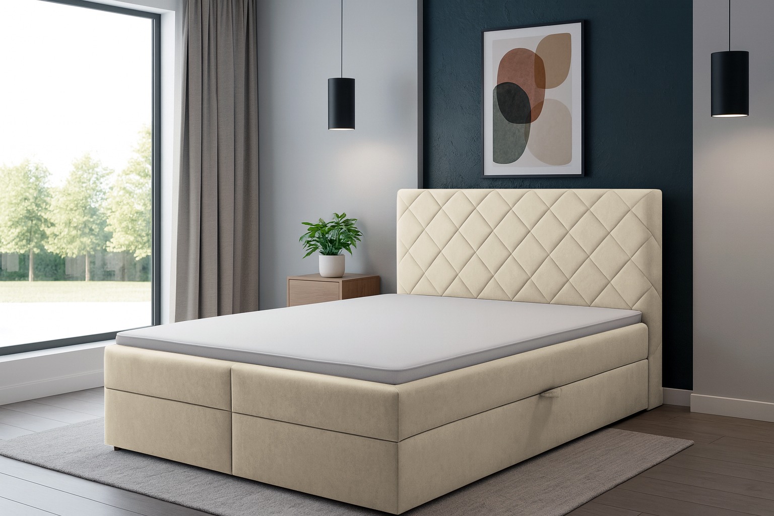 Łóżko kontynentalne Zori 160×200 – podwójne łóżko tapicerowane z pojemnikiem i topperem