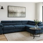 Jego przemyślany kształt w formie litery L z łatwością wkomponuje się w przestrzeń salonu. W ten sposób stworzy naturalne centrum domowego życia. Głęboki, granatowy kolor tapicerki nadaje wnętrzu wyrafinowanego charakteru. Doskonale współgra z dodatkami w odcieniach złota, szarości czy naturalnego drewna. Wysokie, chromowane nóżki dodają całej konstrukcji wizualnej lekkości. Co ważne, tapicerowany tył mebla pozwala na ustawienie go w dowolnym miejscu, nawet na środku pokoju.