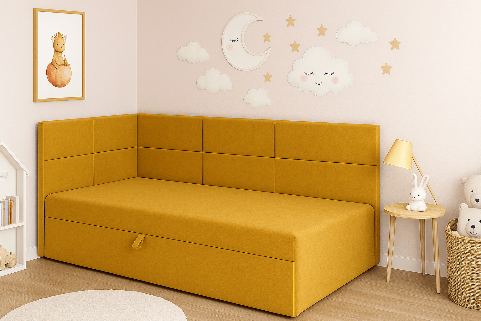 Łóżko zostało wyposażone w pojemny schowek na pościel, który ułatwia organizację przestrzeni. To świetne rozwiązanie, które pozwala zaoszczędzić miejsce w szafie i utrzymać porządek w pokoju dziecka lub gościnnej sypialni.