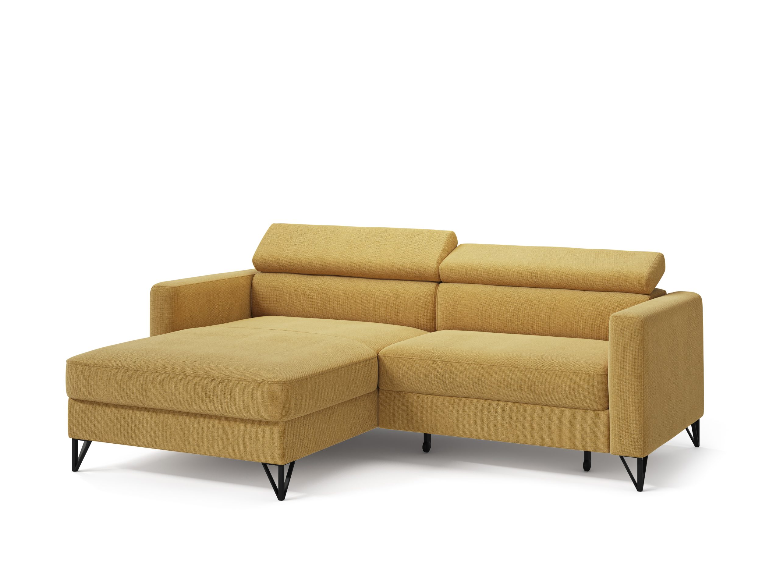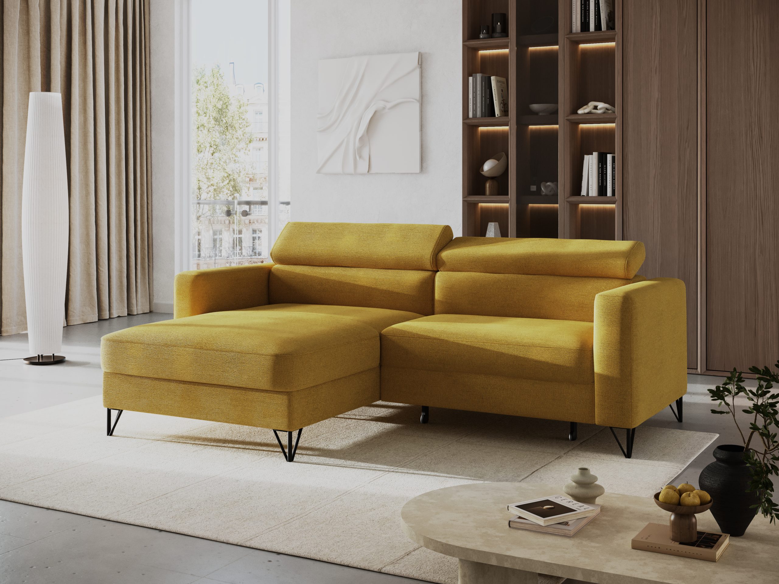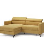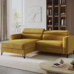 Mebel ma praktyczny kształt litery L. Dlatego świetnie organizuje przestrzeń w salonie, tworząc przytulne miejsce do relaksu. Ciepły, musztardowy odcień tapicerki ożywia aranżację. Wprowadza do pomieszczenia atmosferę pełną słońca i optymizmu. Pasuje idealnie do stylu boho lub nowoczesnego, pięknie komponując się z drewnem oraz naturalnymi dodatkami. Co ważne, tapicerowany tył pozwala ustawić narożnik w dowolnym punkcie pokoju.
